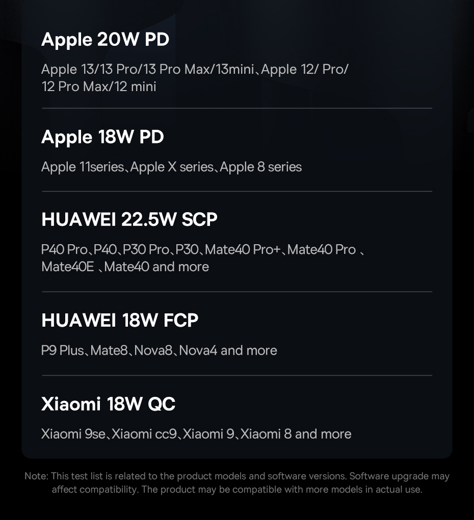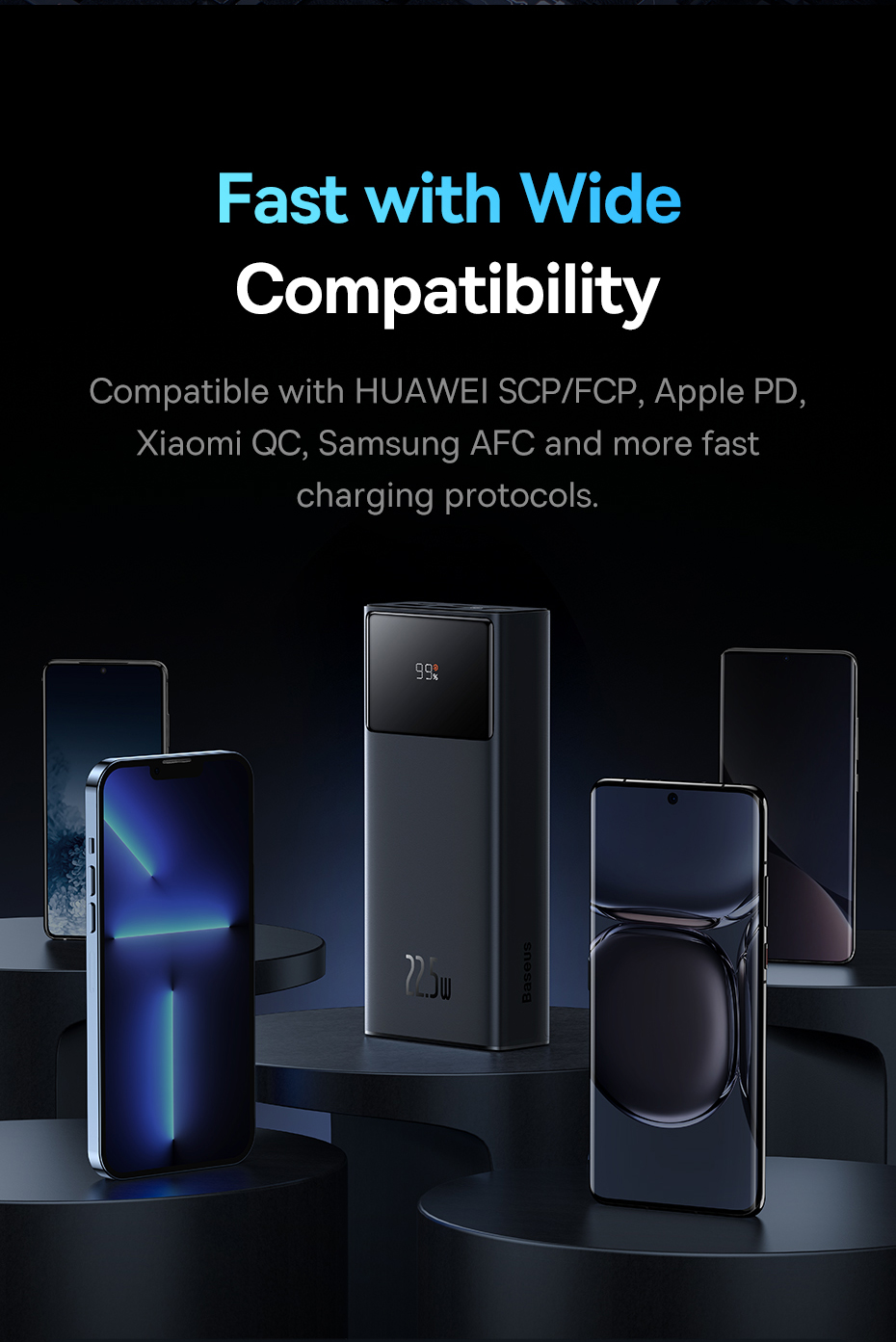 - The device is compatible with Huawei SCP/FCP, Apple PD, Xiaomi QC and Samsung AFC, among others. The Baseus product will charge your phone or tablet in no time! The powerbank is equipped with the following ports: Micro input, Type-C input, Type-C output, USB1/USB2 outputs. As you can see – the possibilities are endless