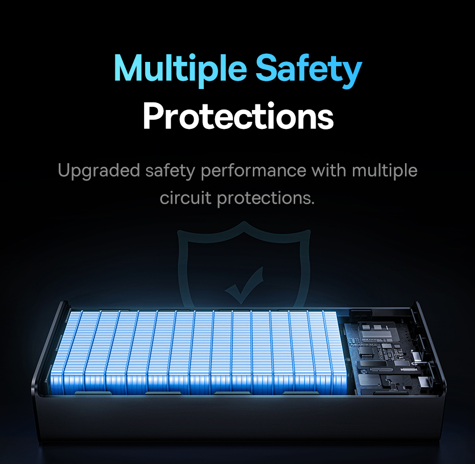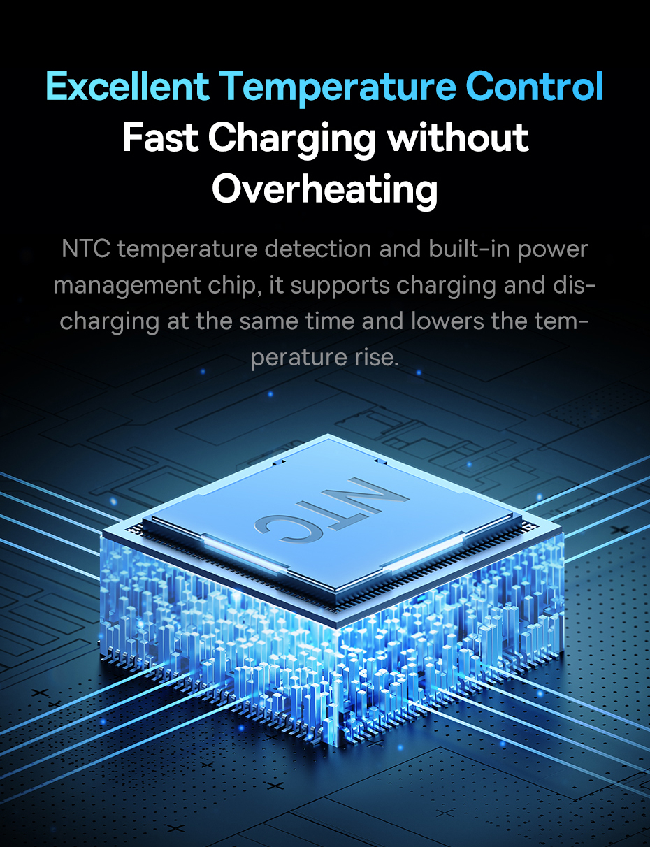 - An NTC temperature sensor is built into the device, which, together with a smart chip, ensures safe charging and protects against overheating. The powerbank guarantees multi-level protection against overcharging, overvoltage, overcurrent, short circuit and electromagnetic field. You can charge your devices of choice without worry!