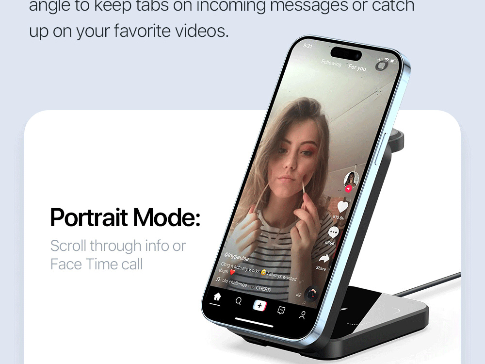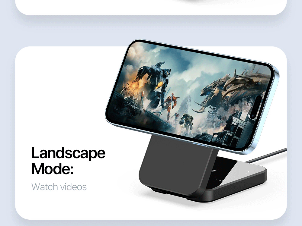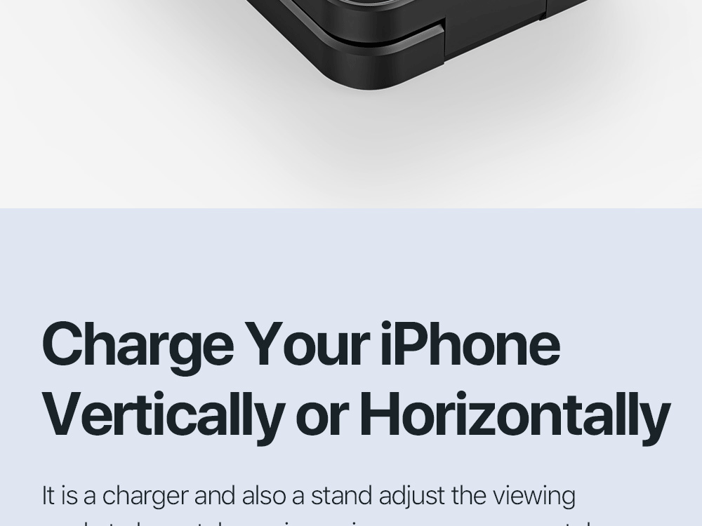 Foldable Phone StandIt can charge and stand your iPhone in portrait or landscape, and the viewing angle is adjustable to view the incoming messages or catch up on your favorite videos and live stream. It is foldable and easy to carry.