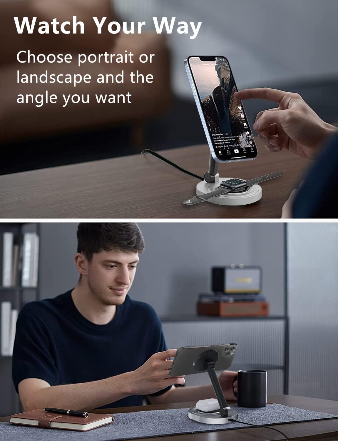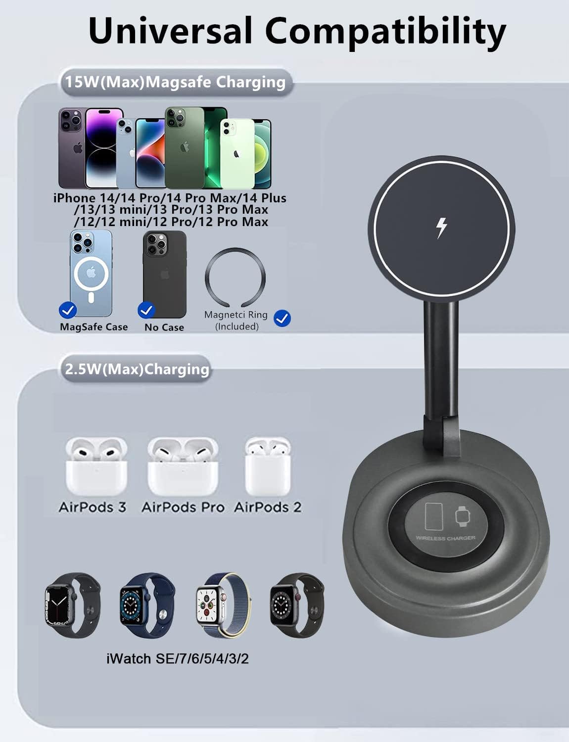 - 【Mag-Safe Charger Stand 2 in 1】Create a new Apple home for your apple devices, a one-stop solution to Apple devices charging, free from messy tangled cables. Compatible with iPhone 15/14/14Plus/14Pro/14Pro Max/13/13 Mini/13Pro/13Pro max/12/12 Mini/12 Pro/12 Pro Max, iWatch Ultra/8/7/SE/6/5/4/3/2, AirPods 3/2/1/Pro. You can charge iphone and iWatch or Airpods at the same time. Note: This charging stand is not compatible with other smart watches.