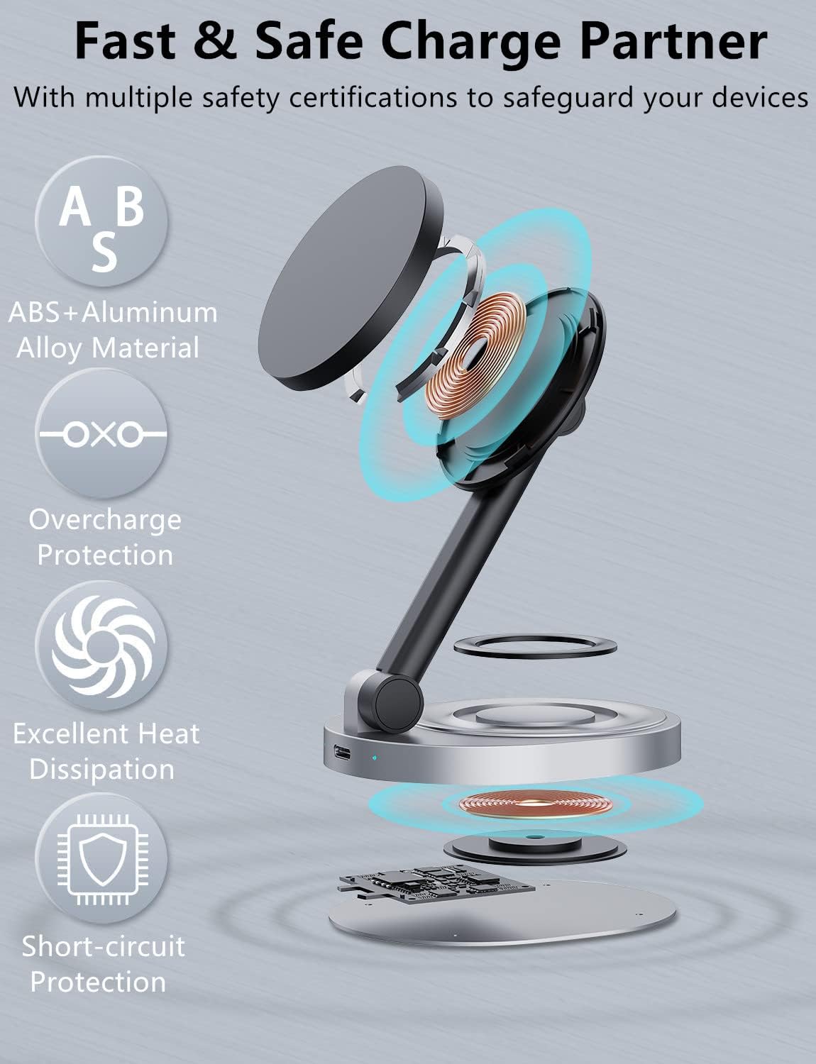 - 【Magnetic Alignment ● Power in a Snap】This 2 in 1 Wireless Charging Station keeps charging simple and Apple Mag-Safe charger device safe. Just place your Phone on the wireless charger stand, the Magnetic tech will automatically allign the phone to provide precise and efficient charging. It is always kind to stress using Mag-Safe cases or iPhone 15/14/13/12 series without a case. Note: Support charging devices with Mag-Safe case but not support other phone cases.