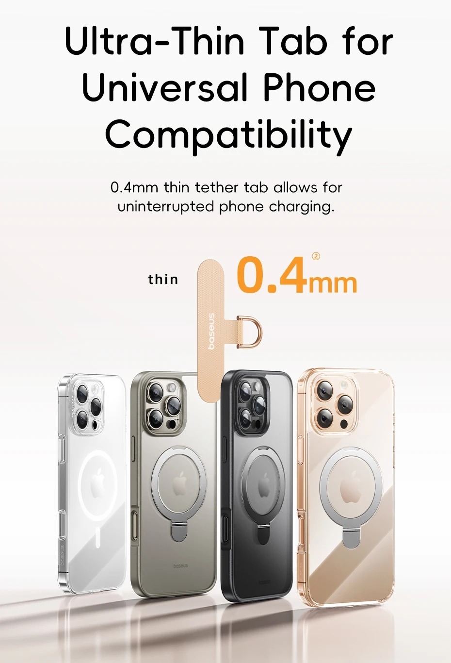0.4mm thin tether tab allows for uninterrupted phone charging.