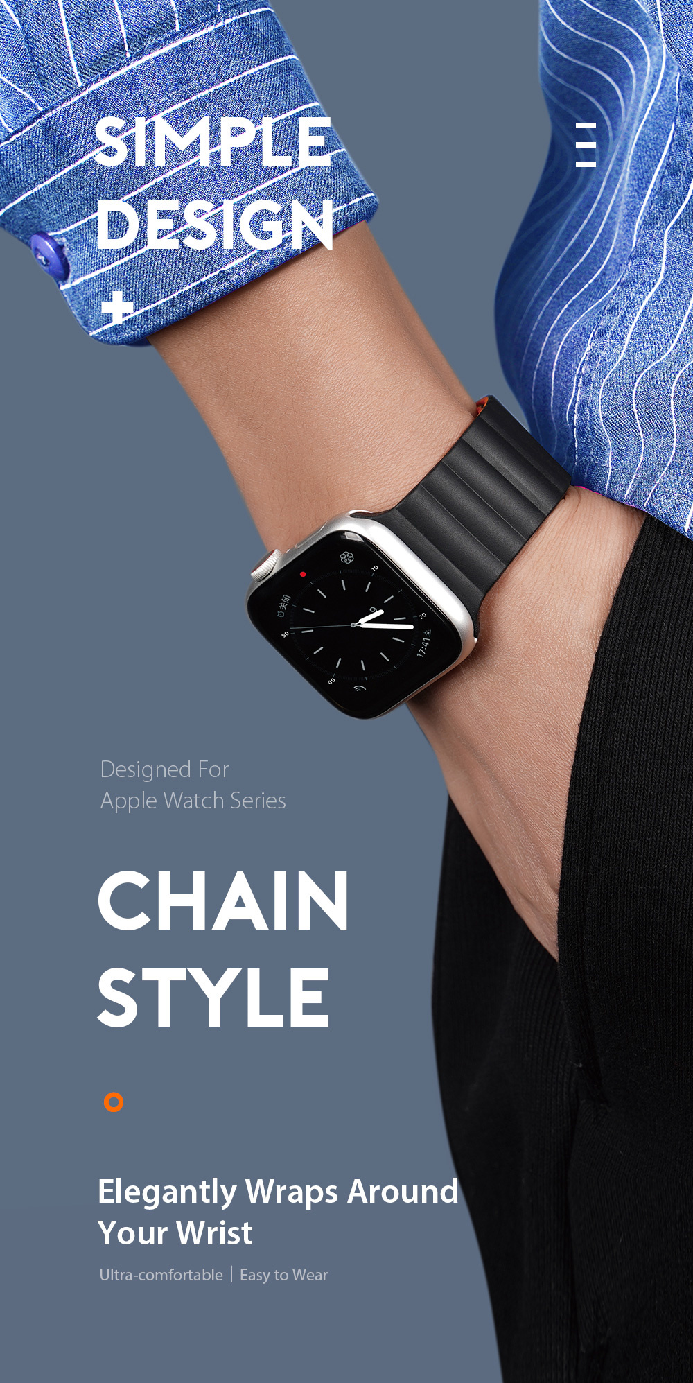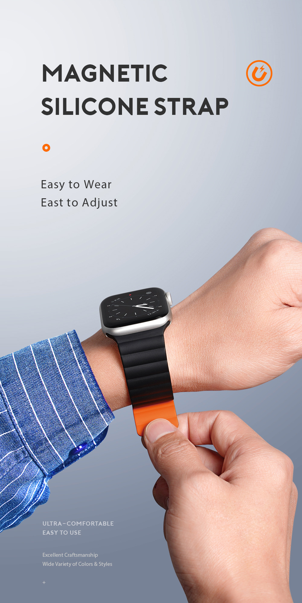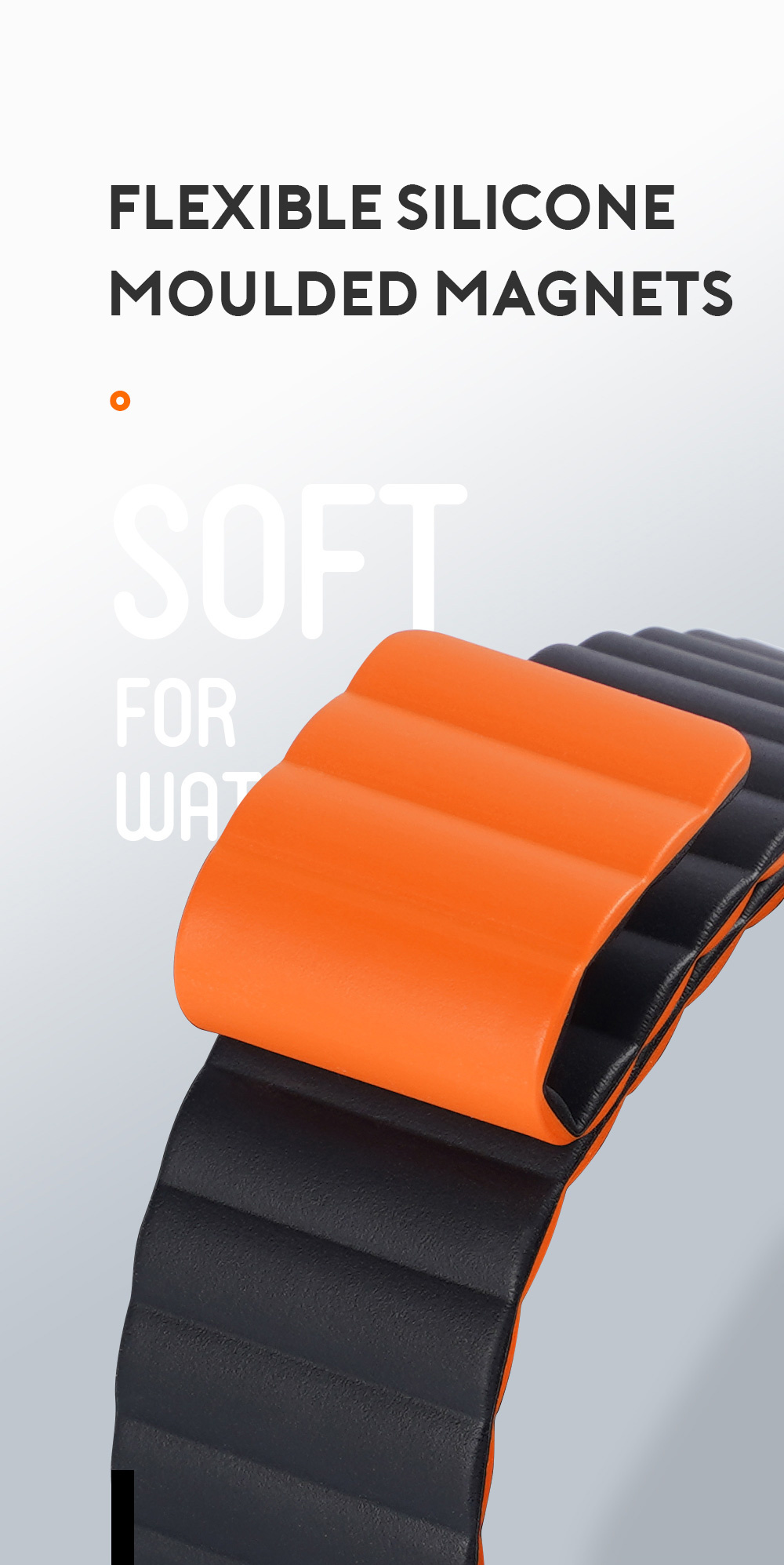 Magnetic, strong clasp allows it to perfectly adapt to the shape of the wrist, ensuring comfortable use. Magically wraps the wrist thanks to the magnets placed inside.
