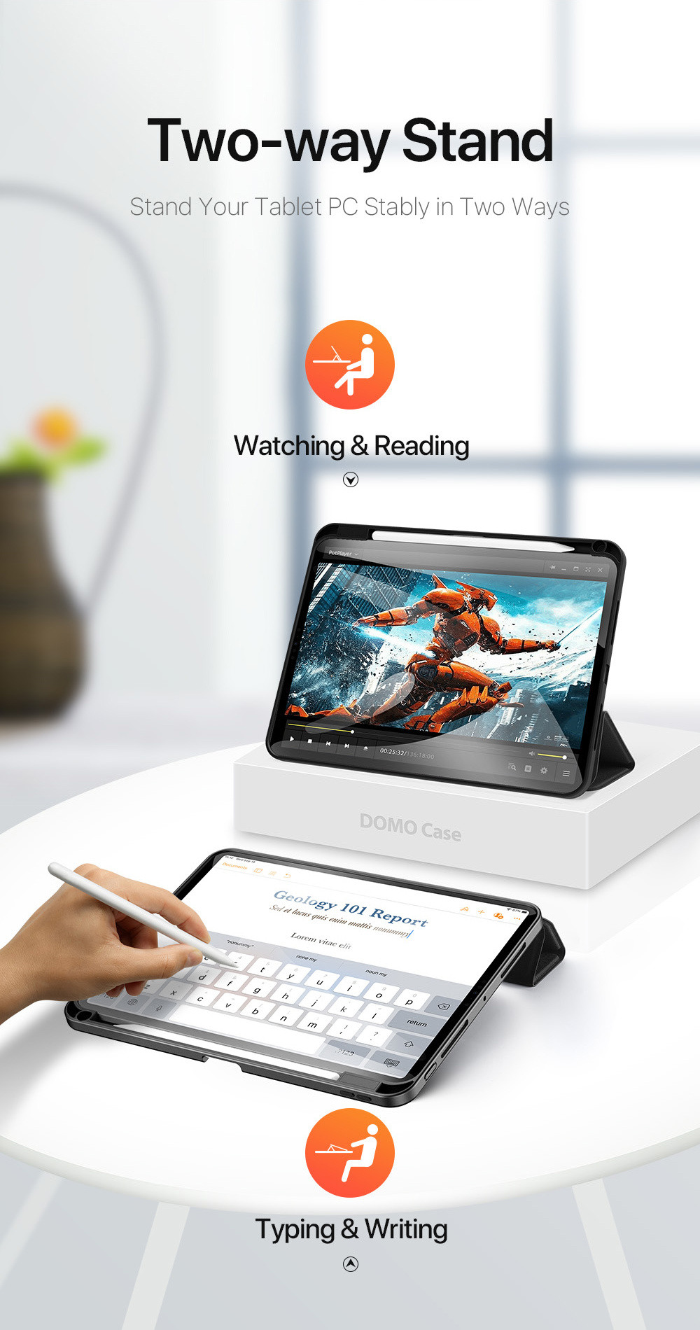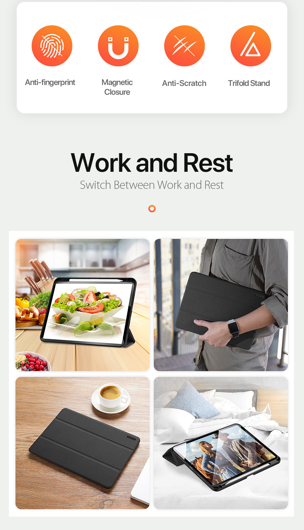 Comes with wake/sleep function, open the case, iPad wakes up; close the case, iPad sleeps.