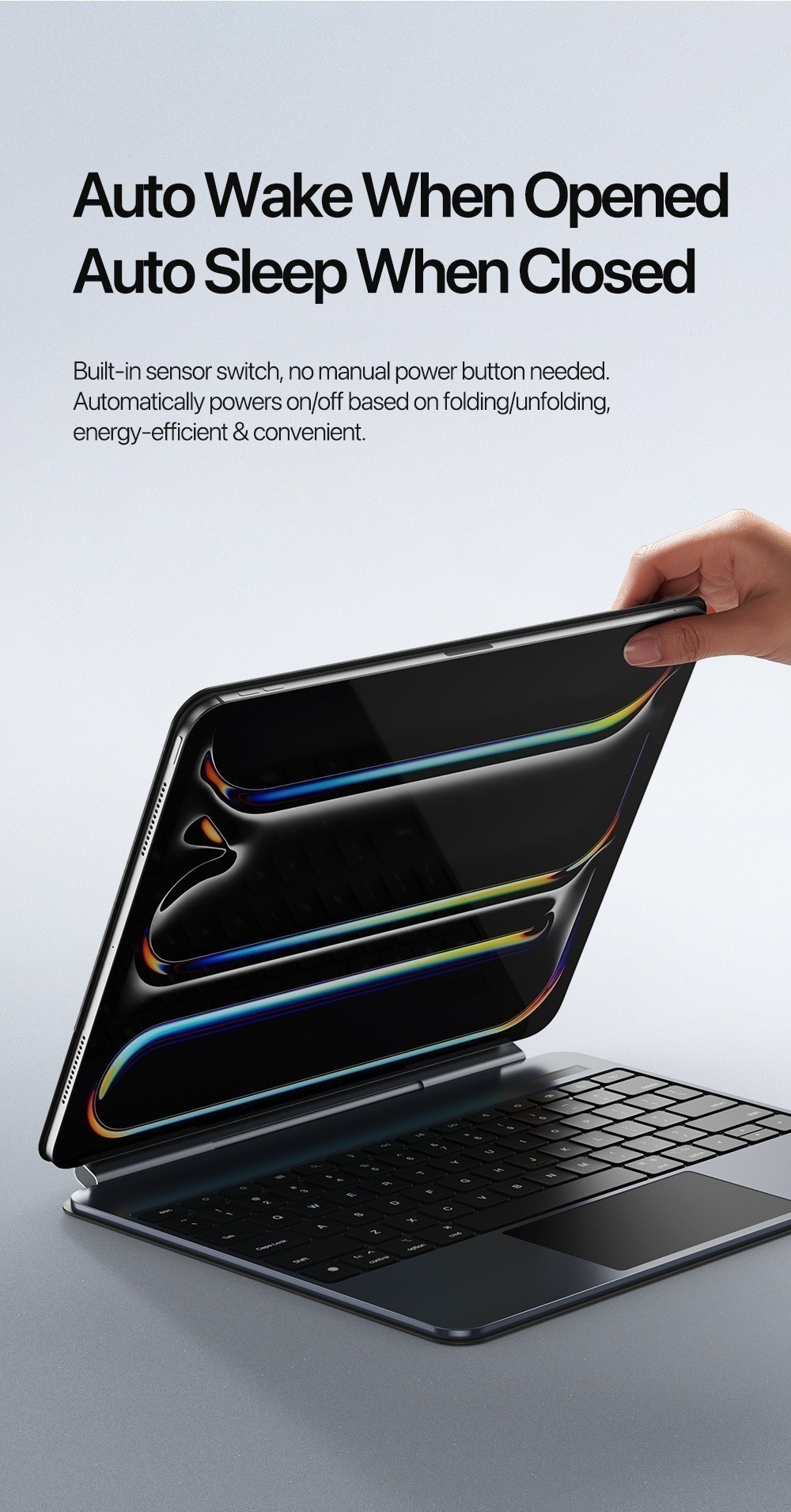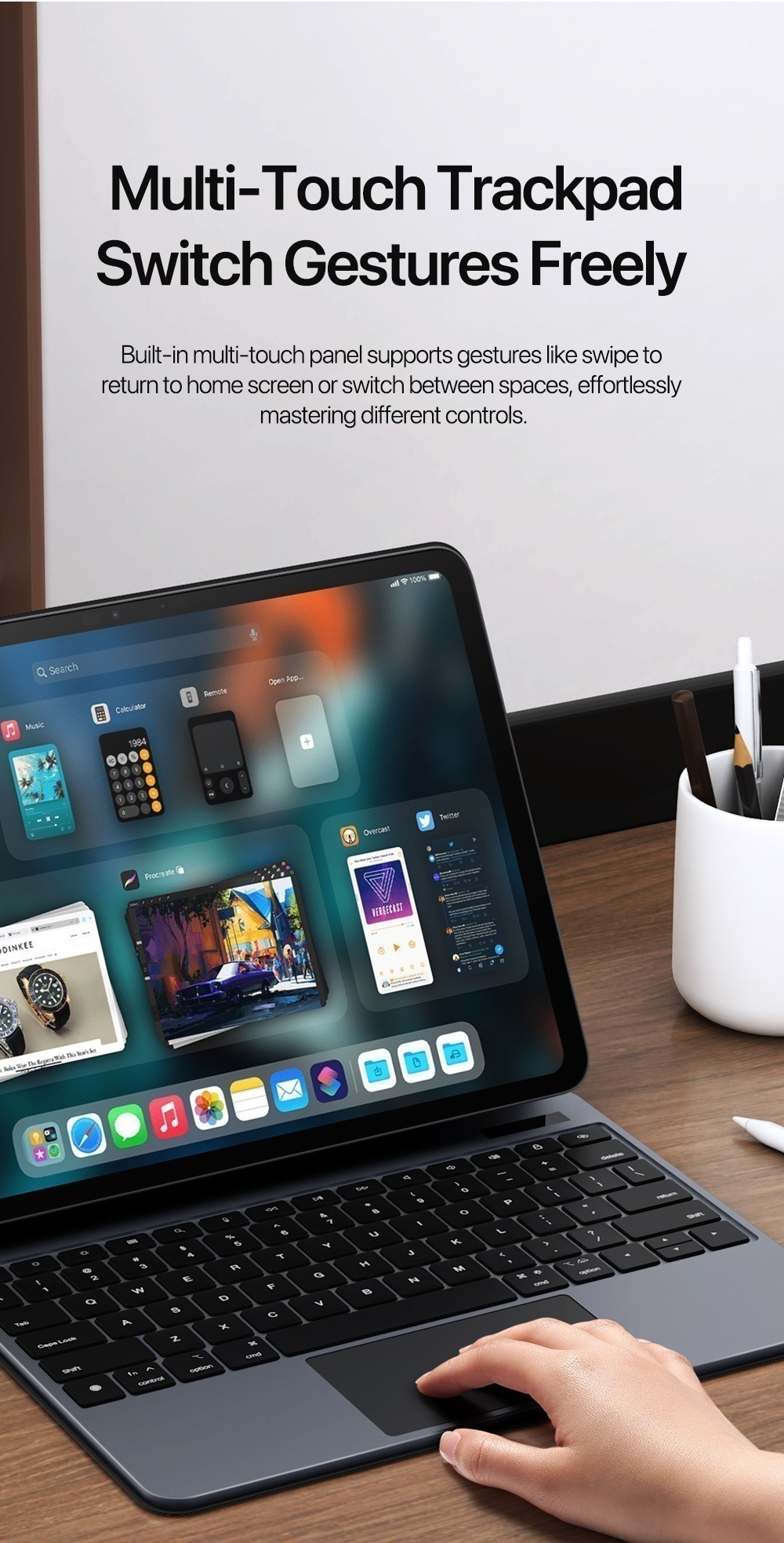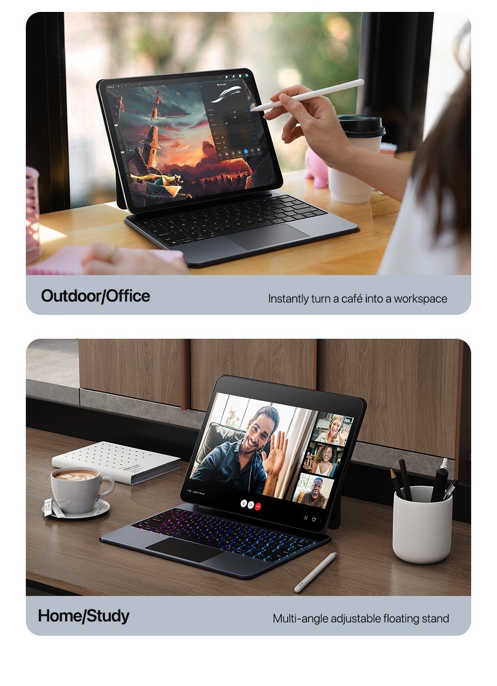 Instantly transforms between keyboard, stand, and case.