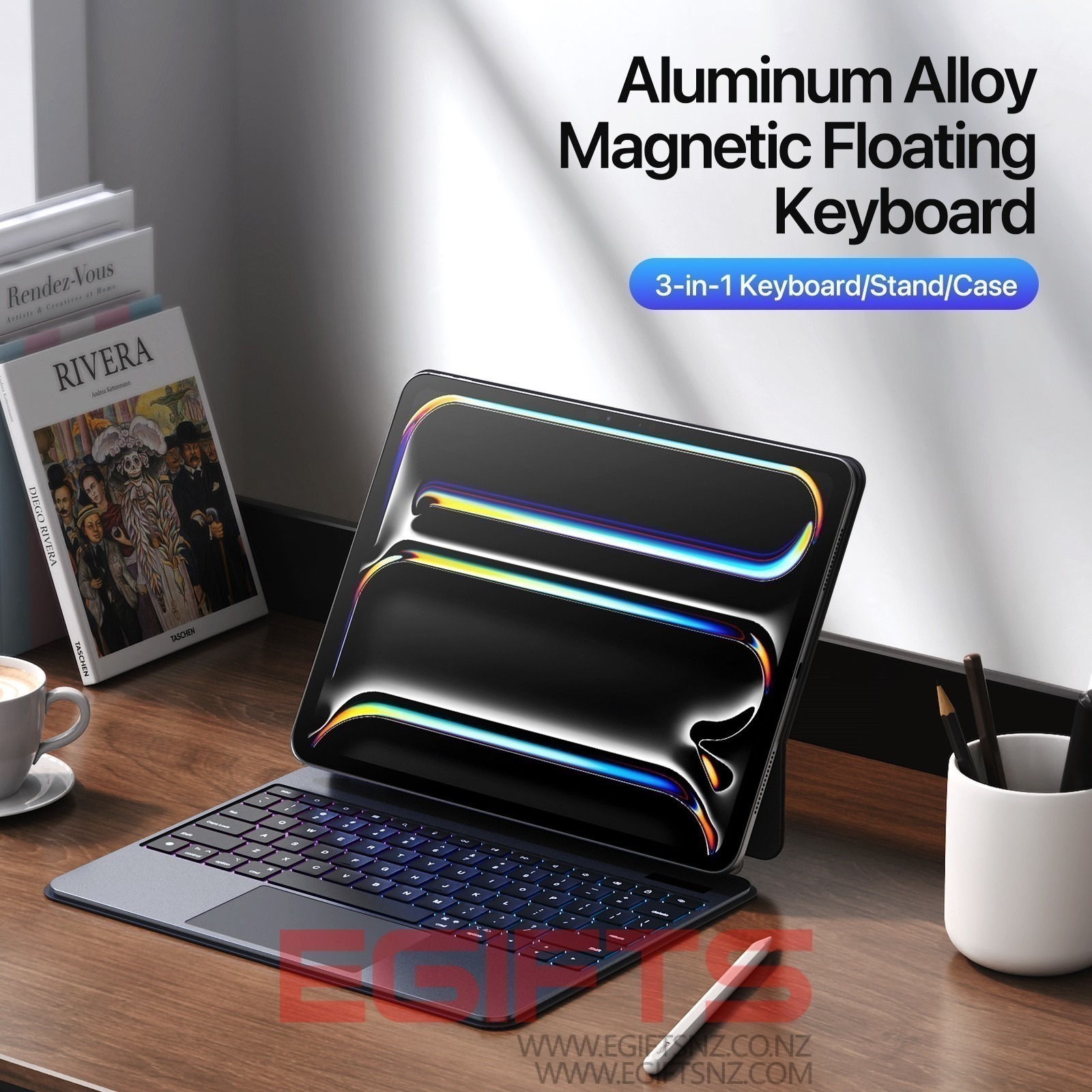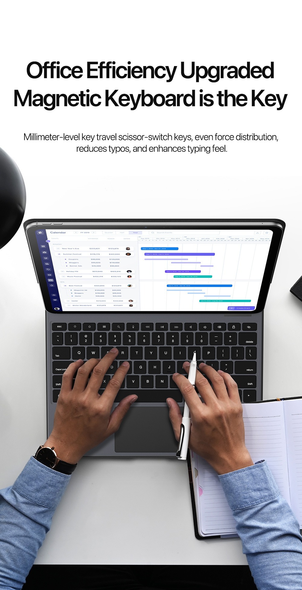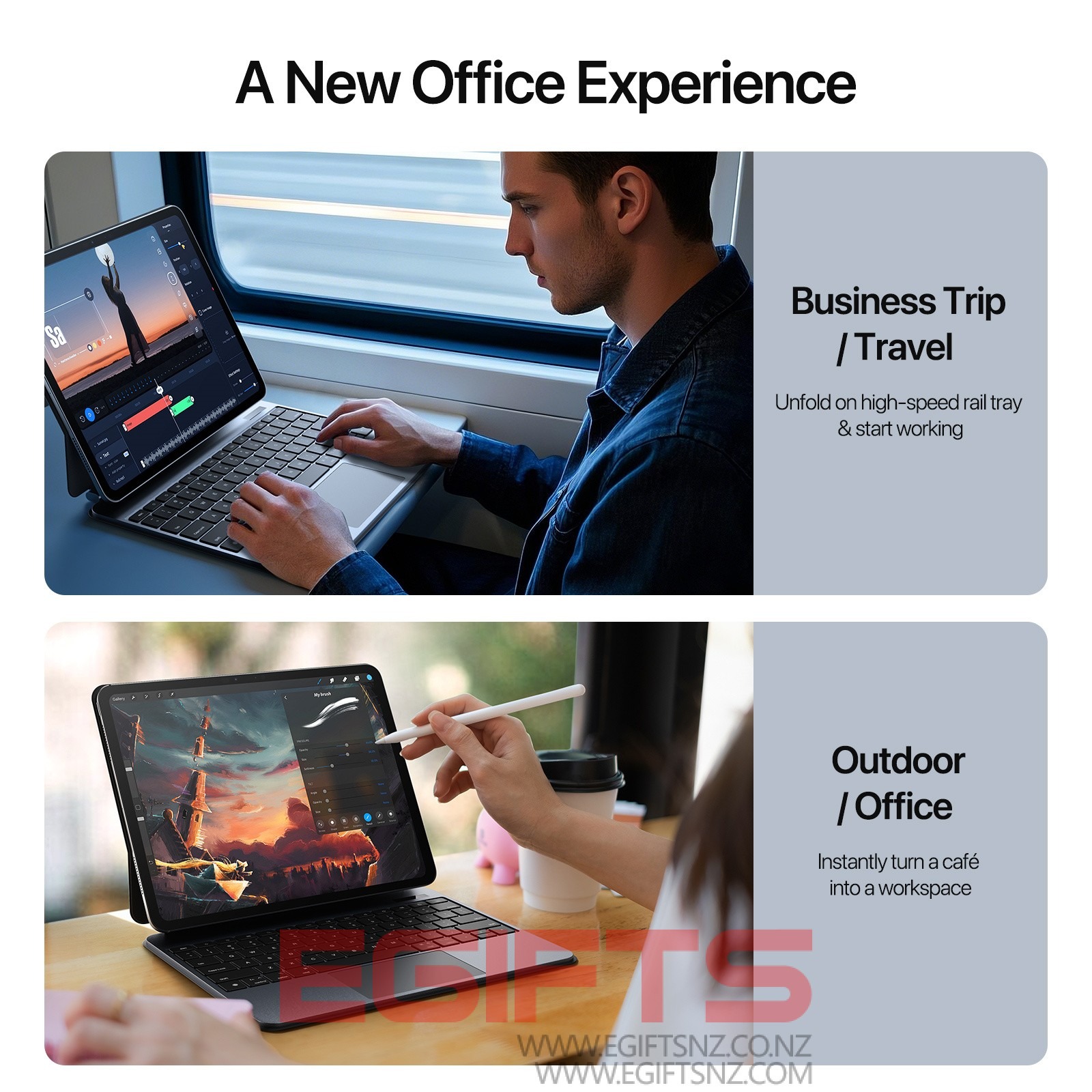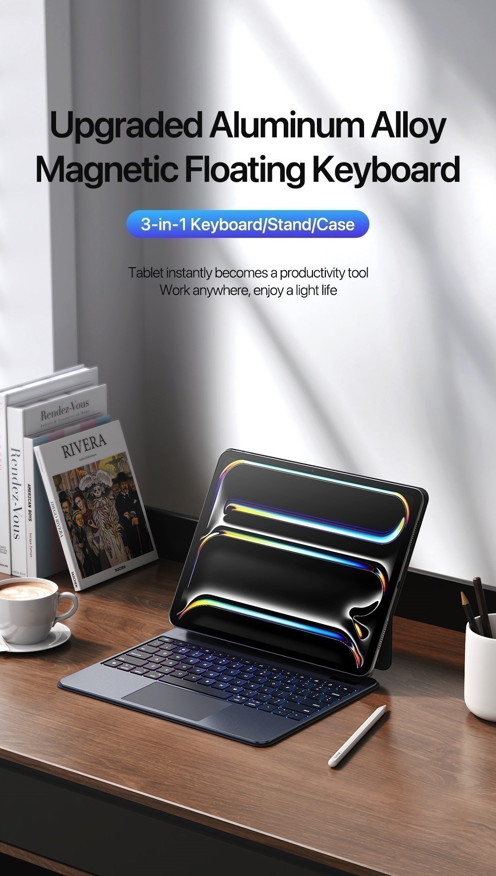 Instantly transforms between keyboard, stand, and case.