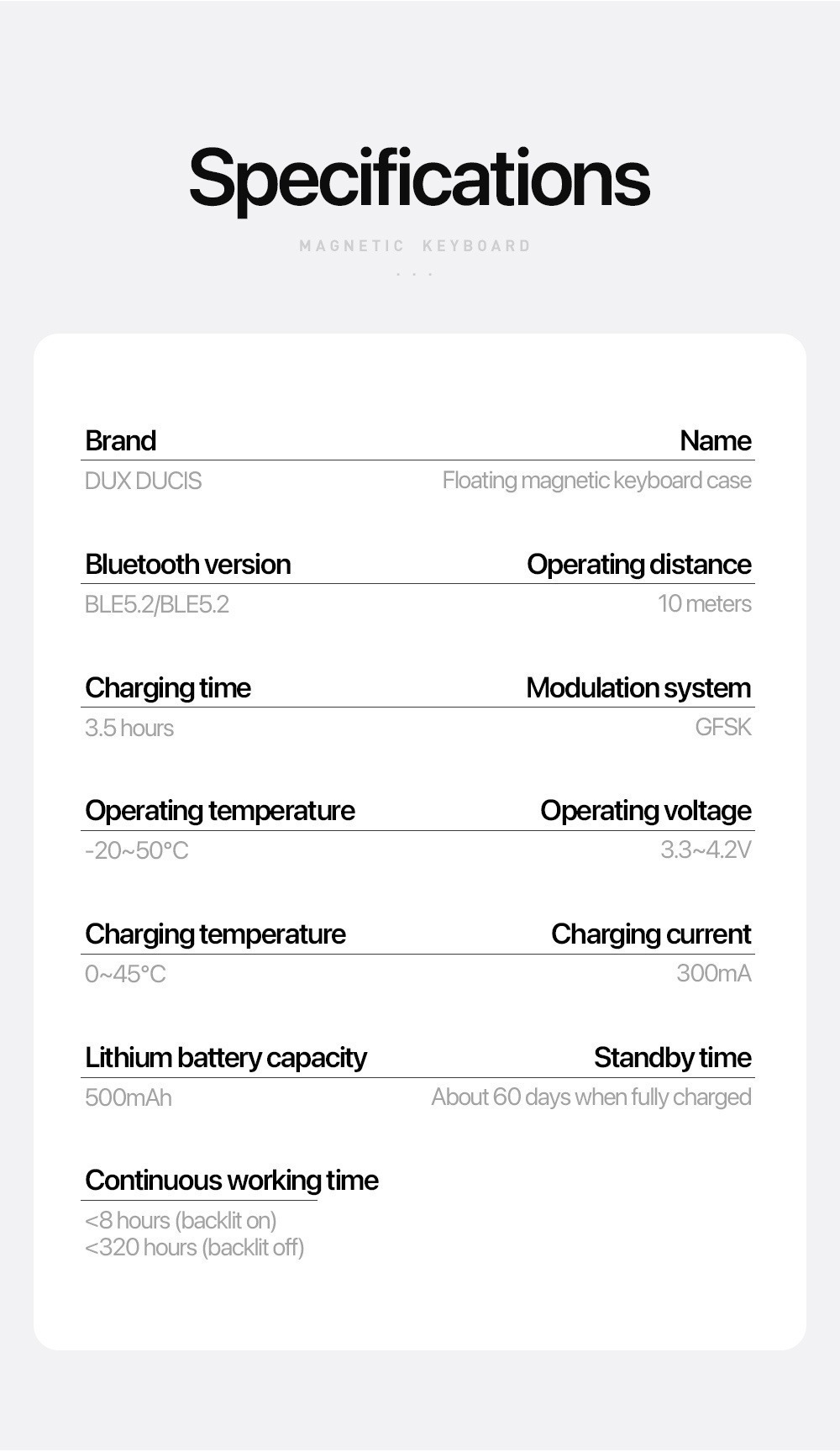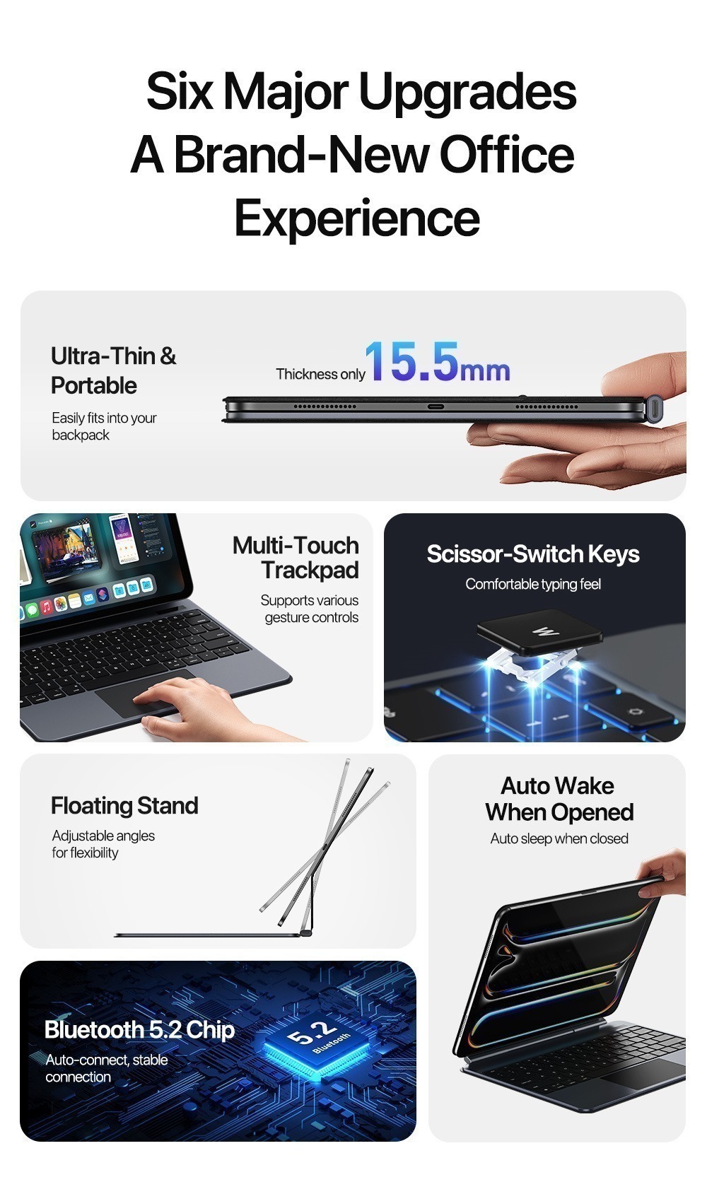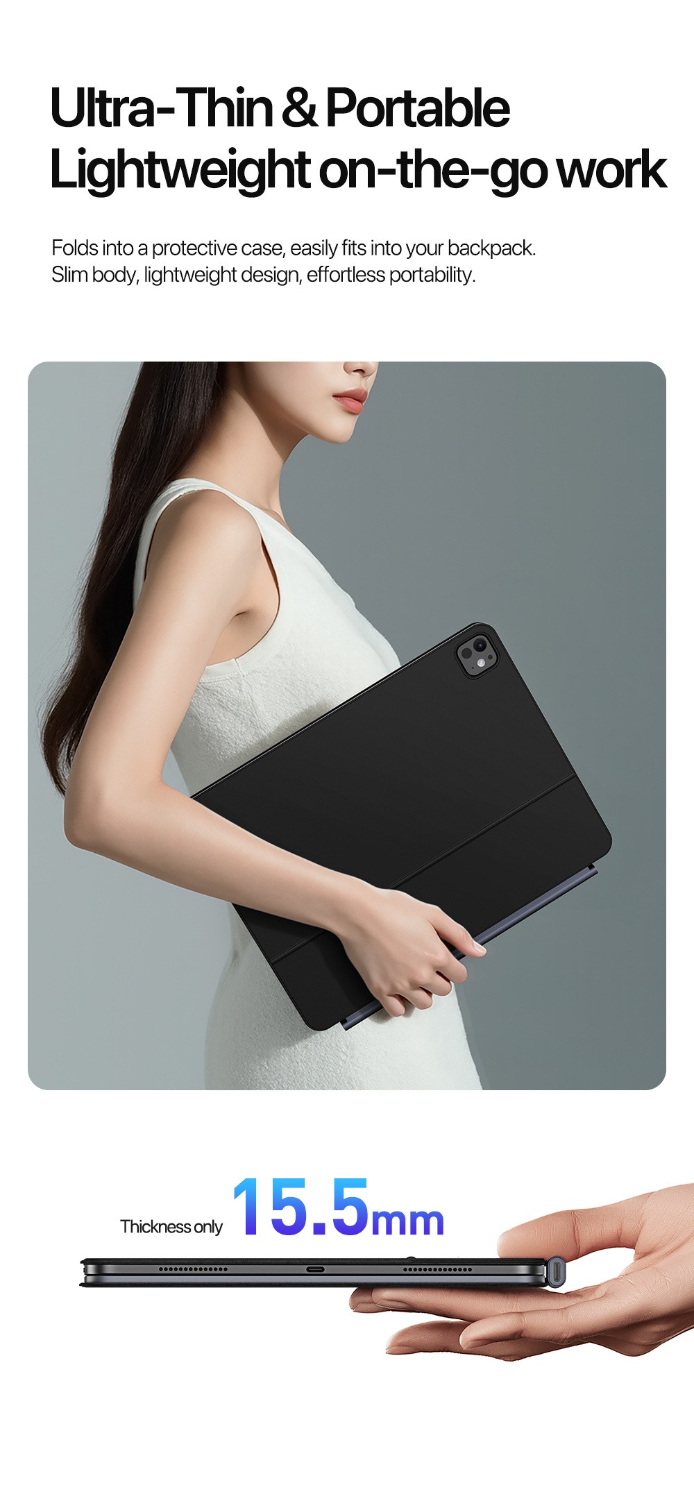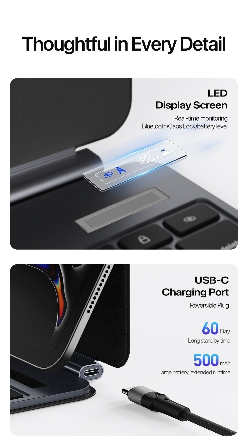 Auto power on/ off, 15.5mm slim profile, 60-day standby with 500mAh battery.