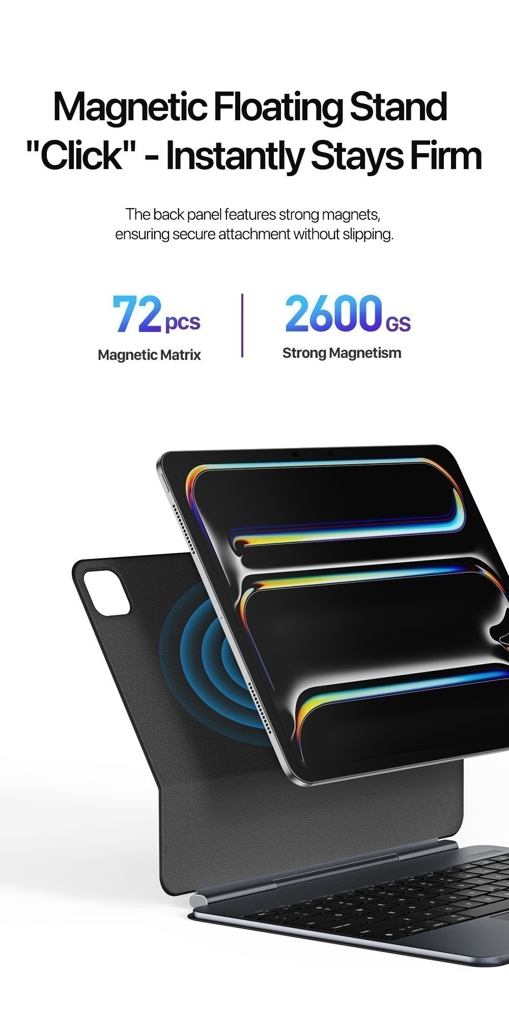 Strong magnets secure the tablet at any angle;