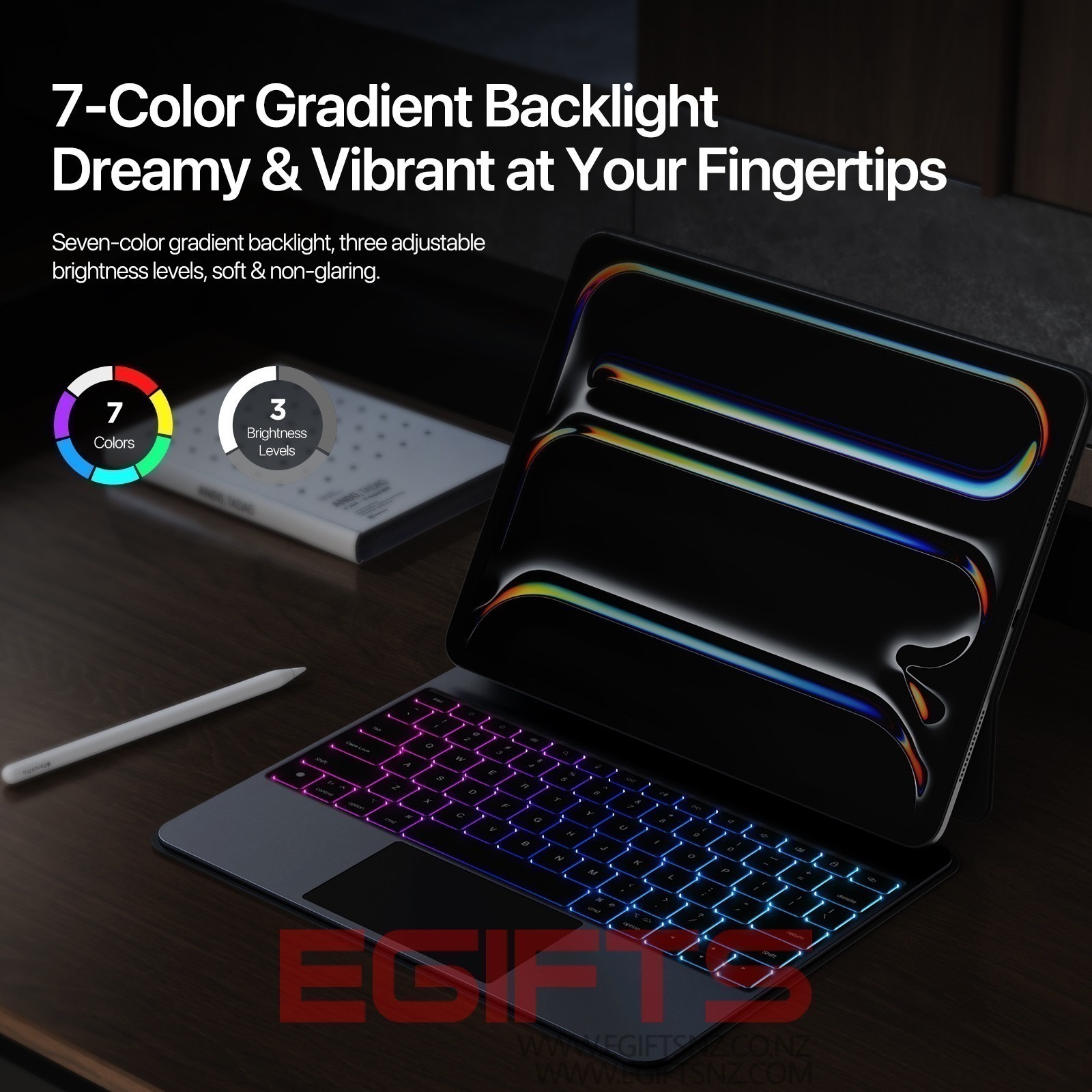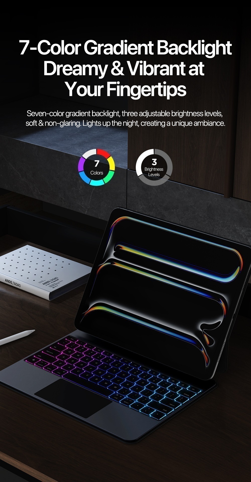 Quiet 1.5mm scissor keys, oil-resistant keycaps, and dreamy 7-color backlight;