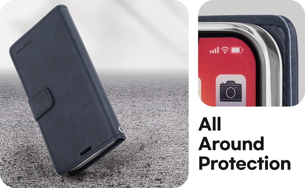 - [All Around Protection] Double the protection with a durable PU leather exterior and flexible TPU inner case ensures your phone against drops and bumps. The inner case with raised lip technology protects the screen and rear camera against scratches while safely lift from flat surfaces.