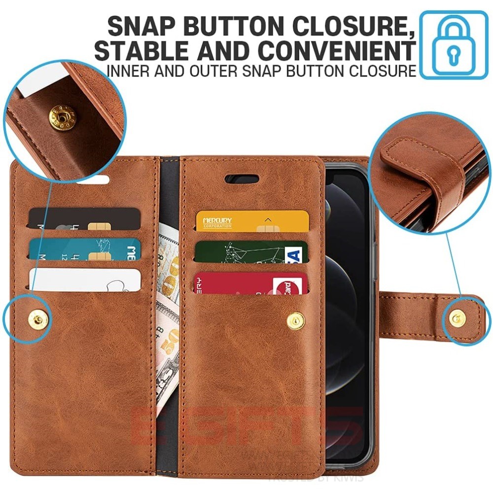 - [Stylish yet Functional] Made of premium PU leather, slim and sleek design adds classic look. It is constructed with 9 card slots & 2 side pockets inside the case and snap closure for easy to use. Make your iPhone practical in style.