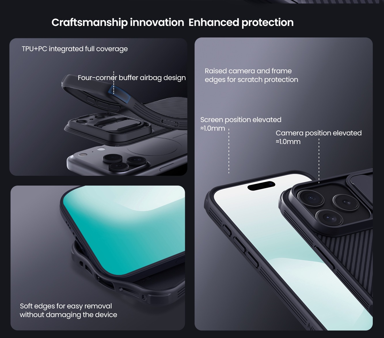 CamShield Pro case combines with classic, fashion and protective elements. Upgrade to magnetic suction function, unlock multiple convenient experiences. Slide cover protects phone camera from scratch, and protects your privacy. Made of environmentally friendly PC and TPU material, which is tough and wear-resistant. Processed by advanced technology. Good touch feeling. Anti fingerprint and oil stain. One-piece molding, completely fits your device. Provides reliable protection. Impact resistant airbags on four corners. All around coverage.