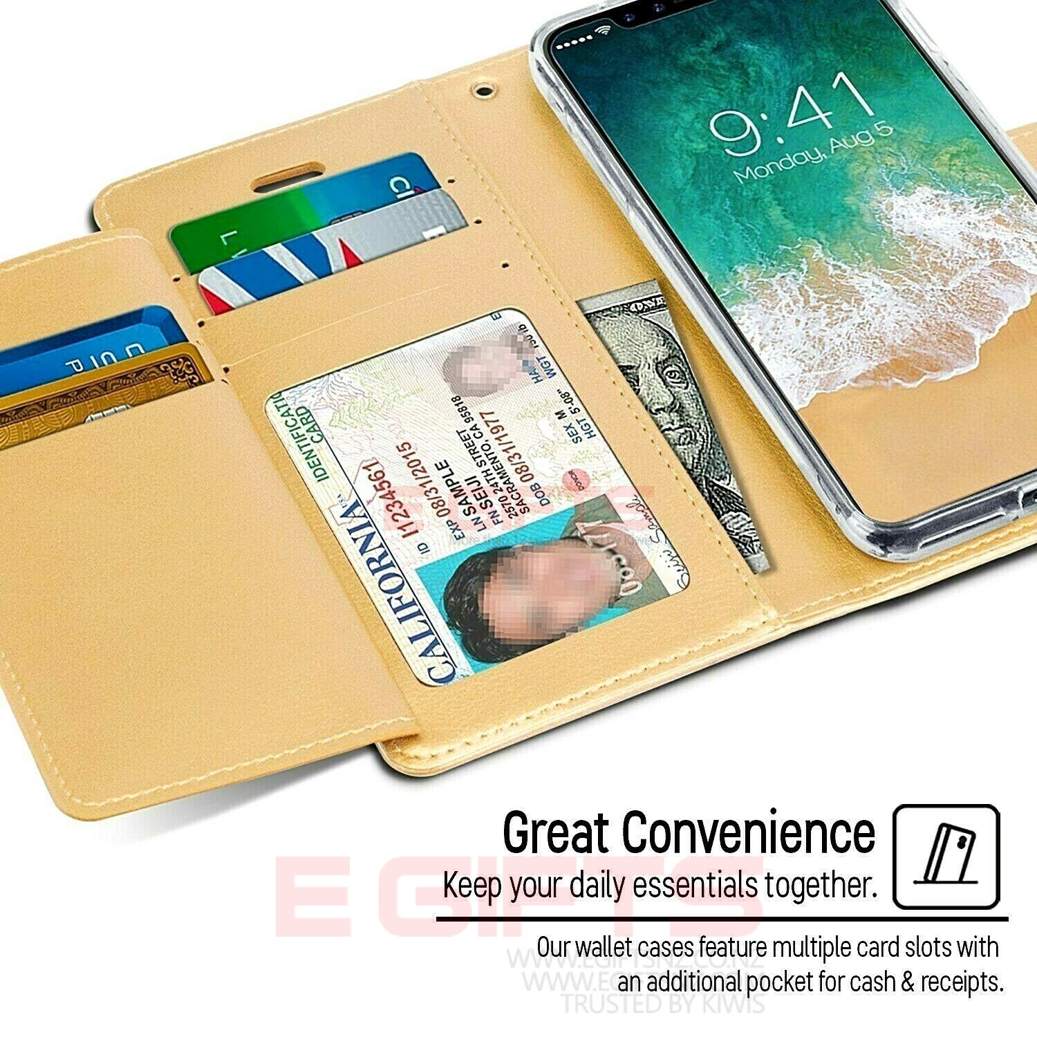 – A stylish wallet case designed with multiple credit card slots and a pocket for bills/receipts to eliminate the need to carry a separate wallet.