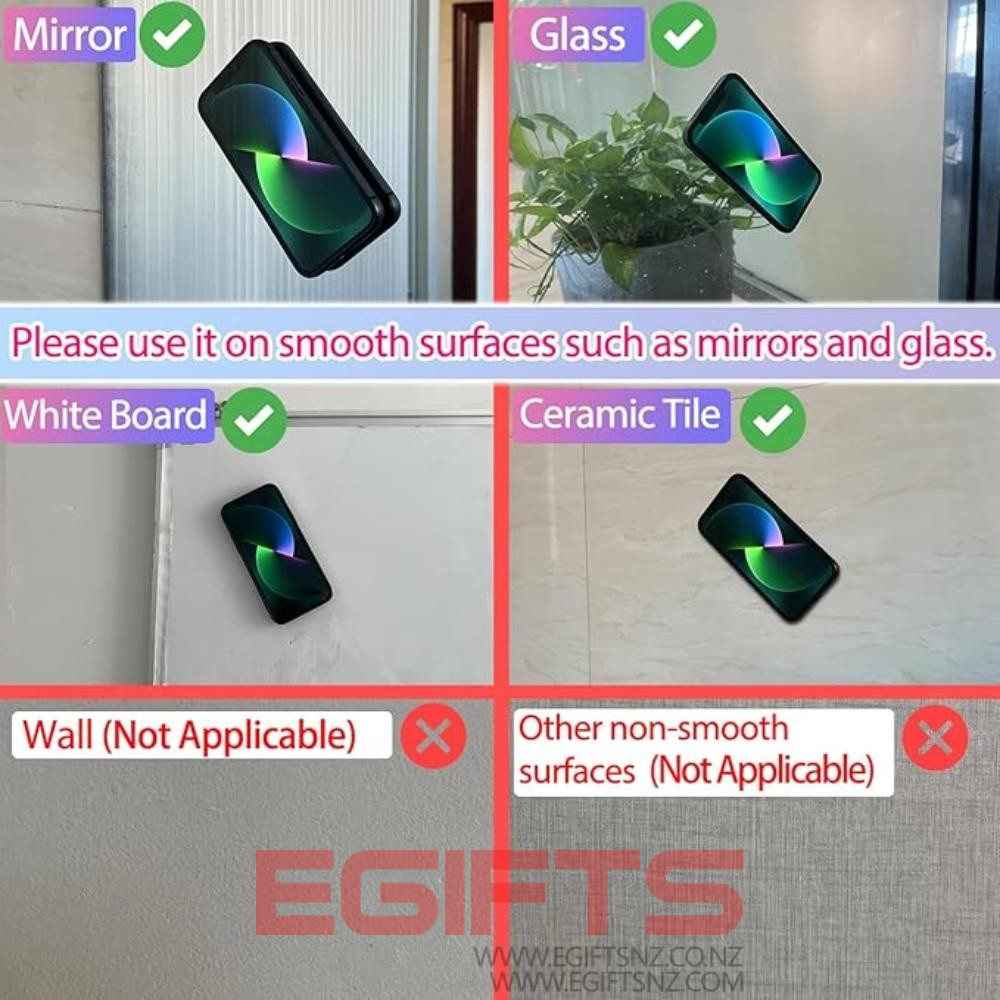 - 【A Strong Grip on the Smooth Surface】You can easily hang your phone anywhere with a smooth surface. All you do is you clean off your phone or your case. It is STURDY and it not only sticks to mirrors, it also sticks to windows, it sticks to refrigerators, tiles and other clean, flat surfaces.