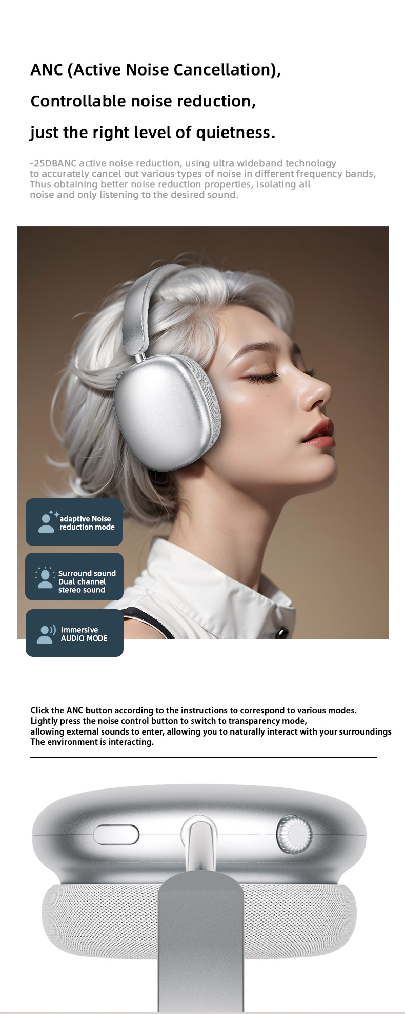 • Immersive Sound with Noise Cancellation: Block out distractions with Active Noise Canceling (ANC) technology, or switch to Transparent Mode to hear ambient sounds for safer listening in busy environments.