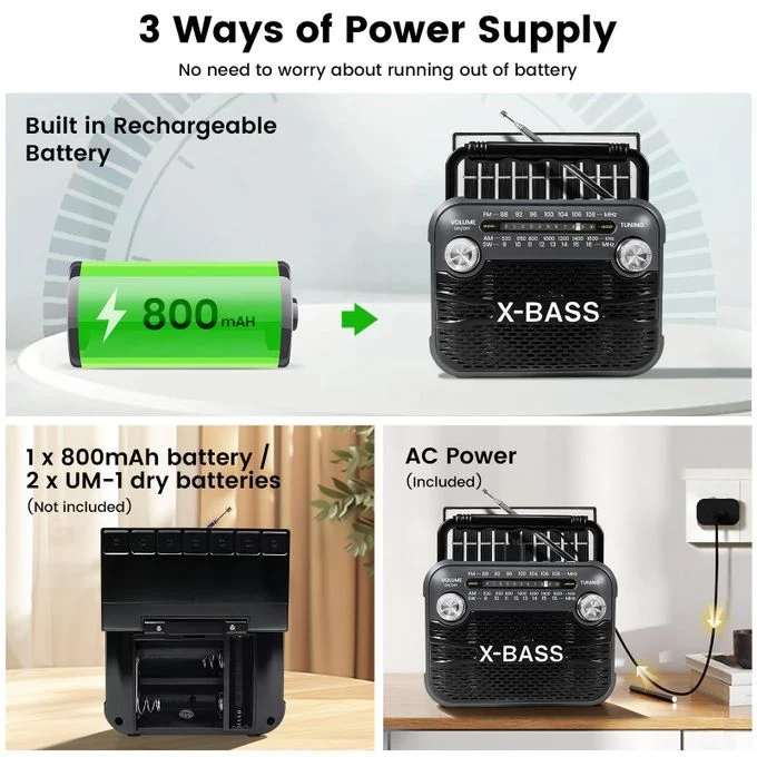 - Dual Power Supply: Powered by a built-in 18650 lithium battery (3.7V/800mAh), 2x UM-1 batteries, or a 5V DC adapter (8-10 hours charging time), providing 4-6 hours of playback.