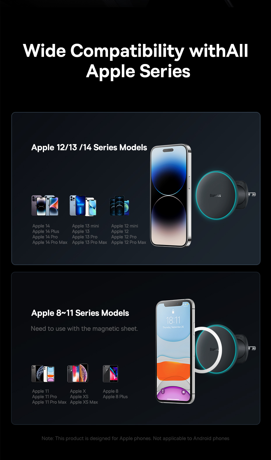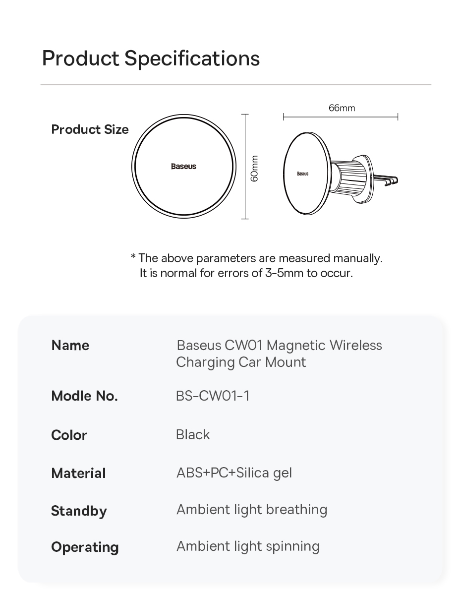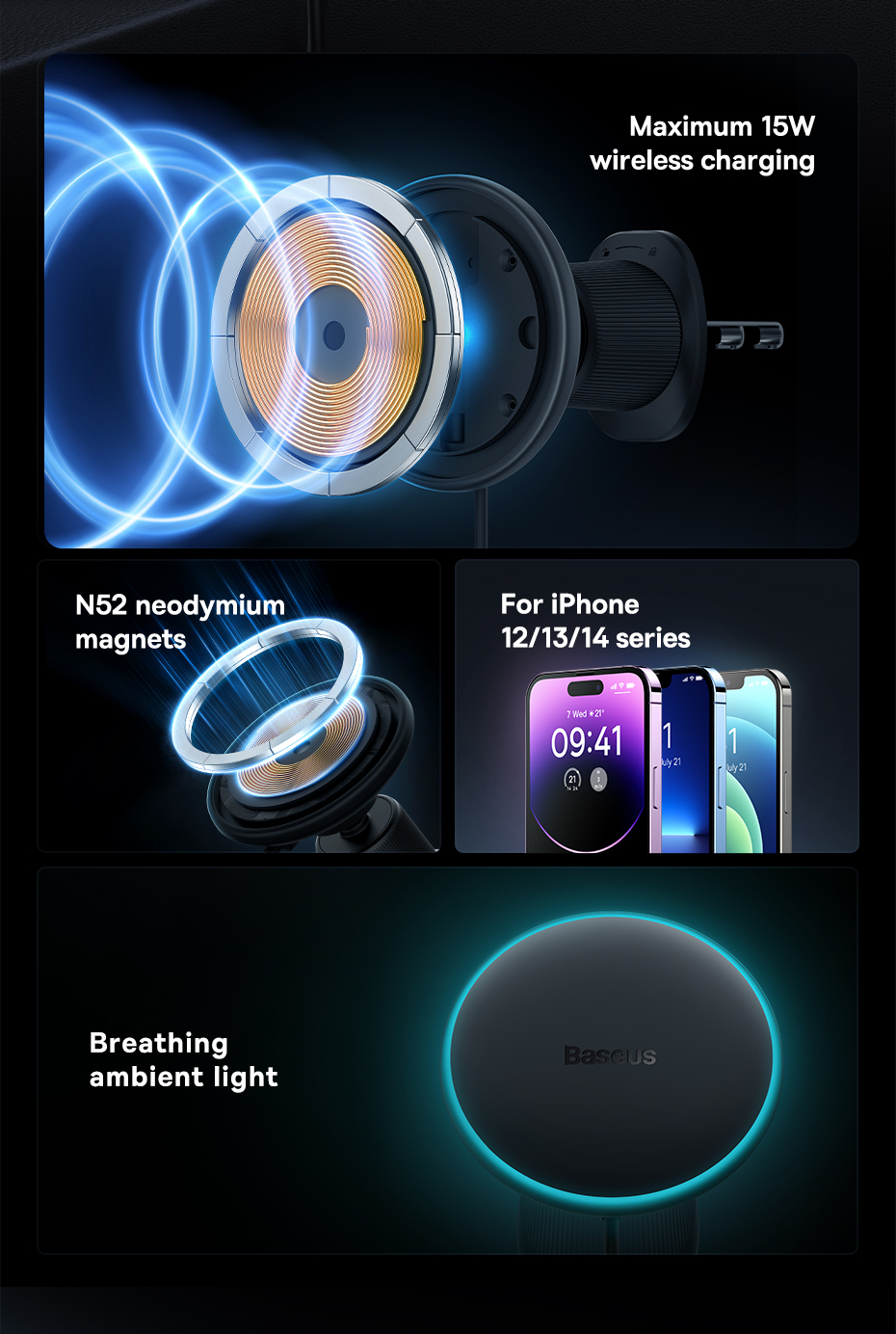 Baseus CW01 MagSafe wireless car charger provides fast 15W wireless charging for iPhone 12-14 series, and a USB-A port to quickly charge Android Phones, car mini-fridges, earphones, fans, etc