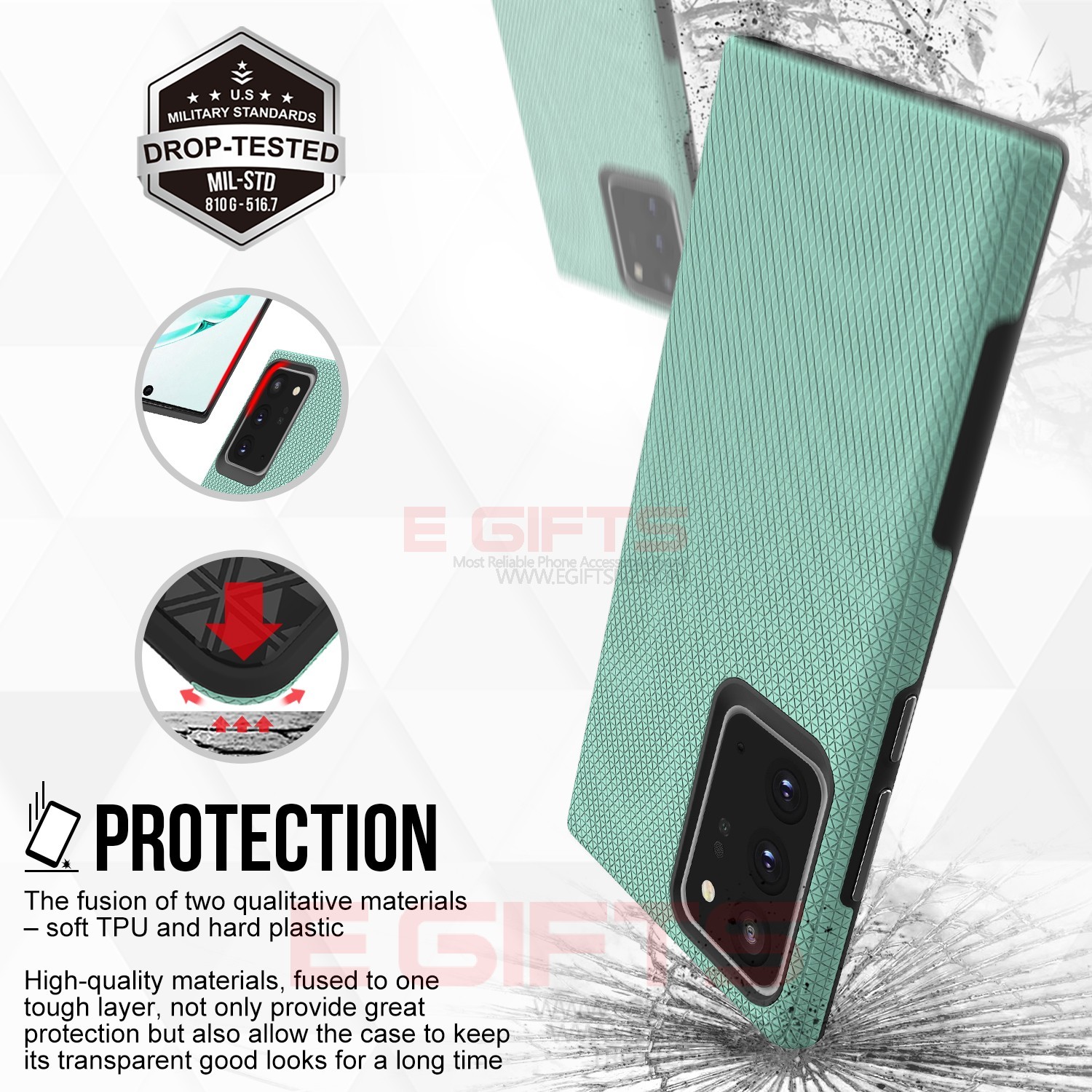 Feature: Protective hybrid case.Double Layered Protection. Drop test to MIL-STD-810G