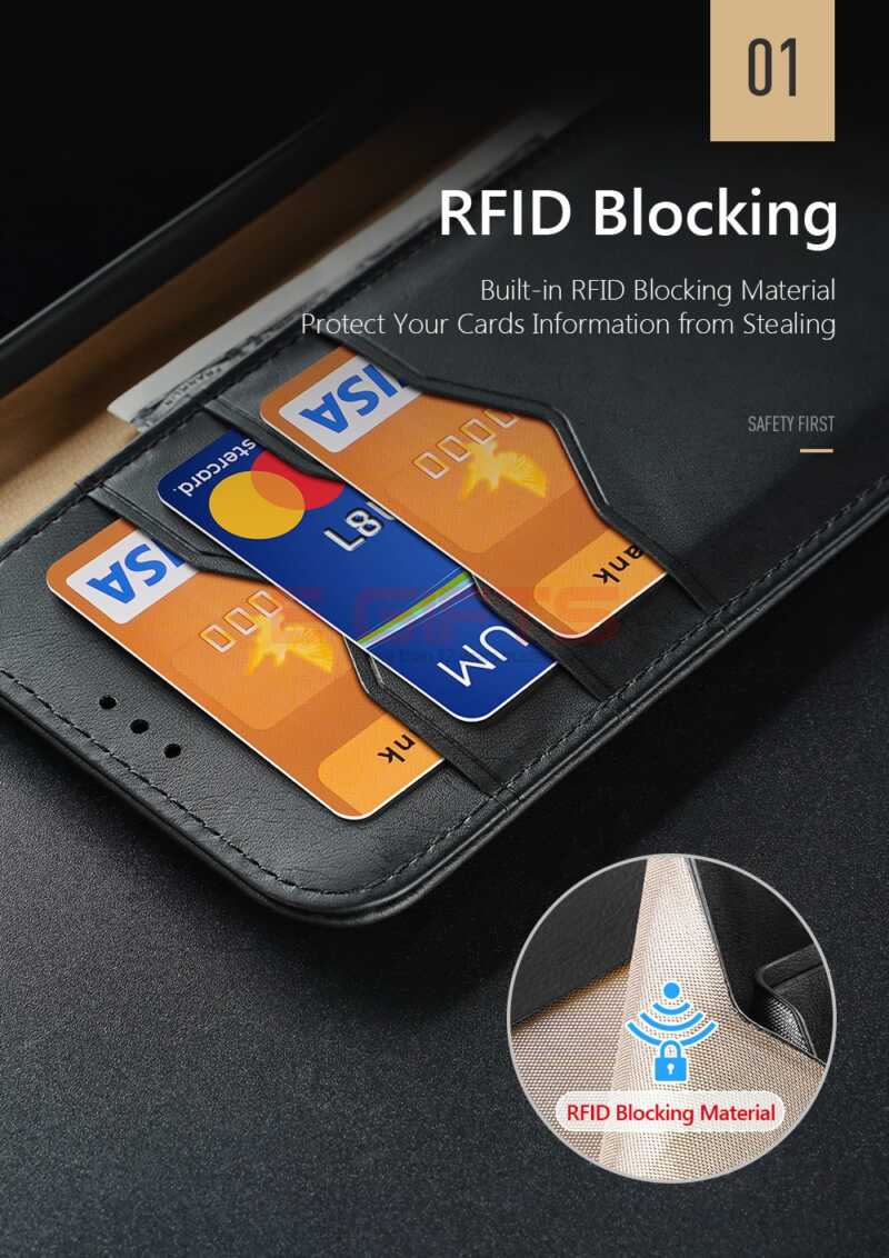 RFID BLOCKING : Most Credit Cards, ID Cards and driver license are set-in RFID chip; RFID scanner can easily read the cards information without touching them. RFID technology application effectively shields the signals and keeps your personal information safety.