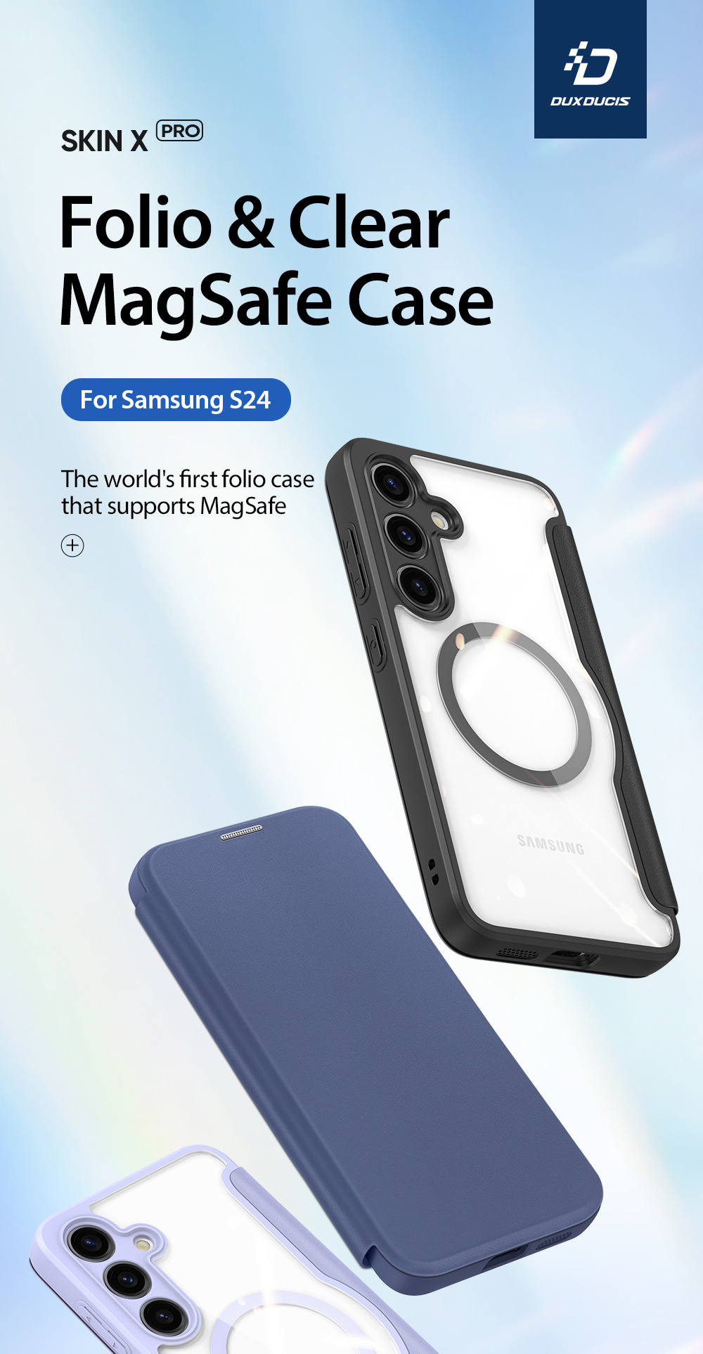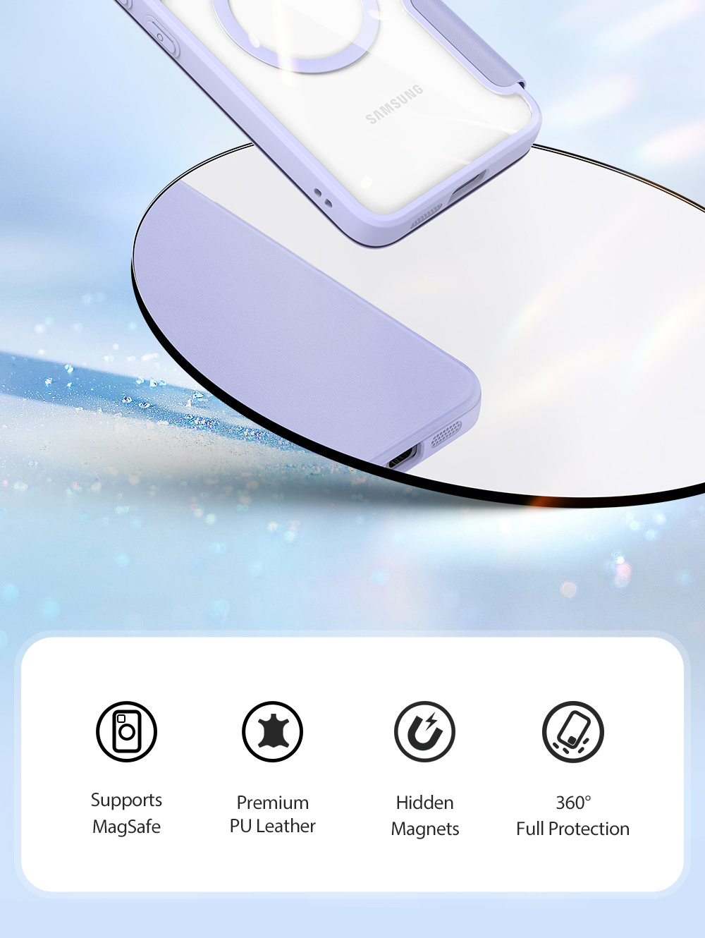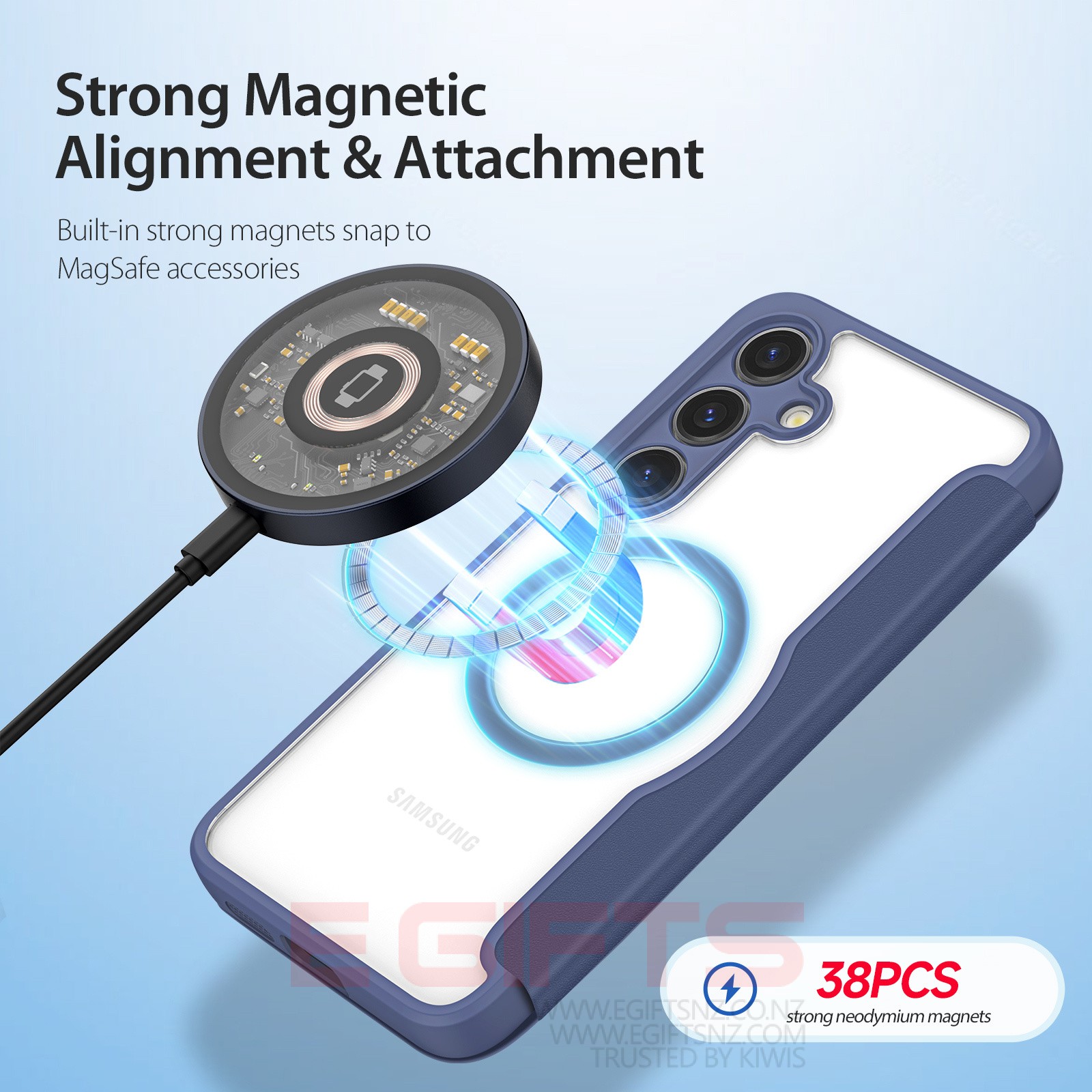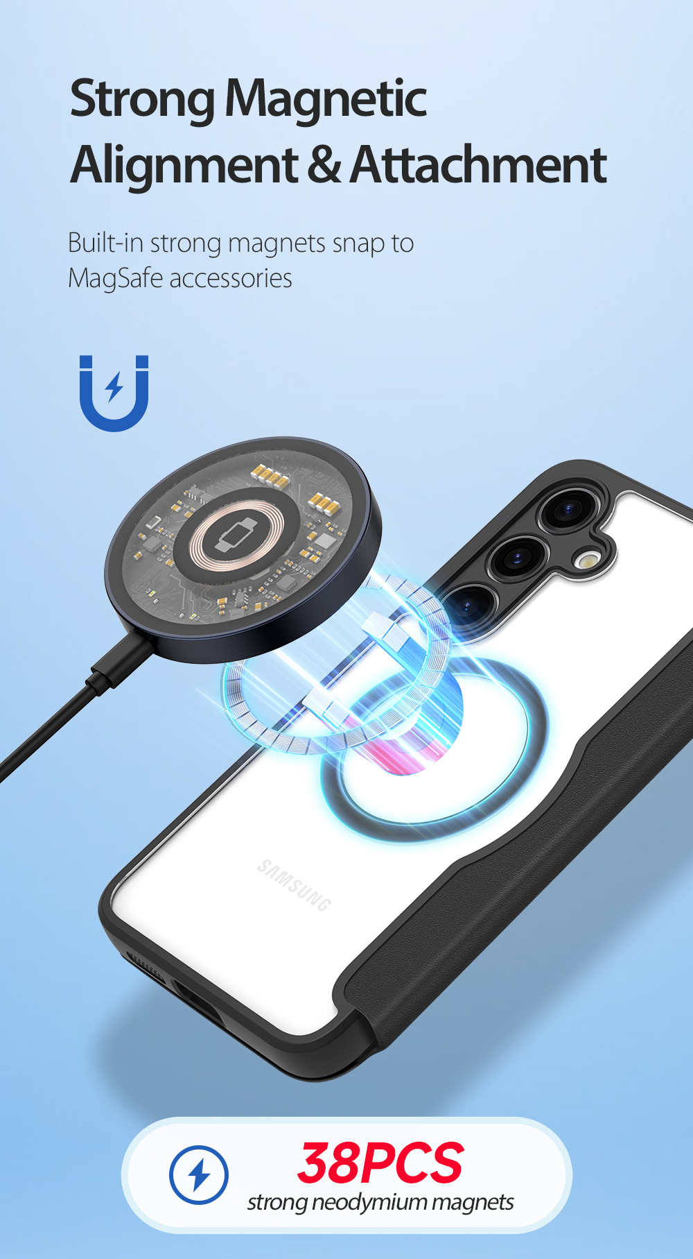 The world’s first folio case with MagSafe for Samsung S24 Plus, it works with Magsafe chargers, wallets, power banks. When it’s time to charge your Phone, just leave the case on your Phone and attach to your MagSafe charger.