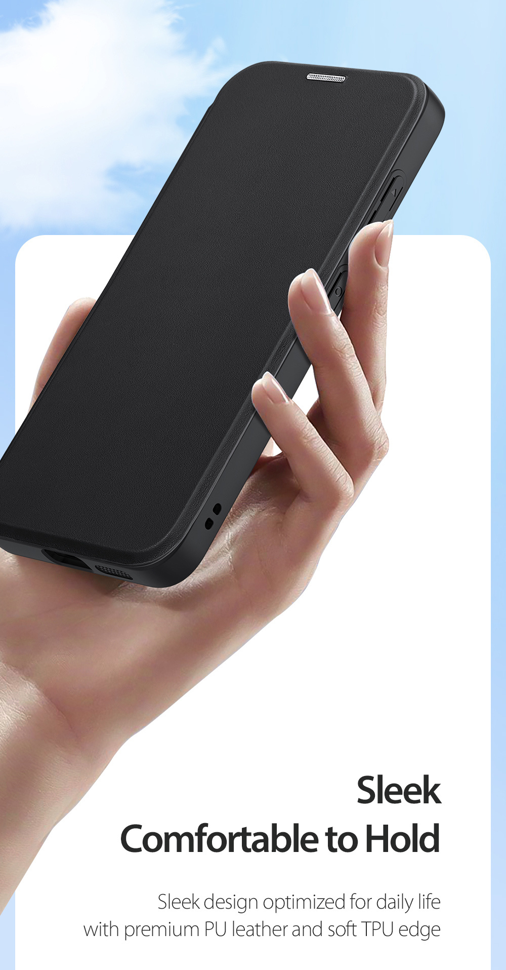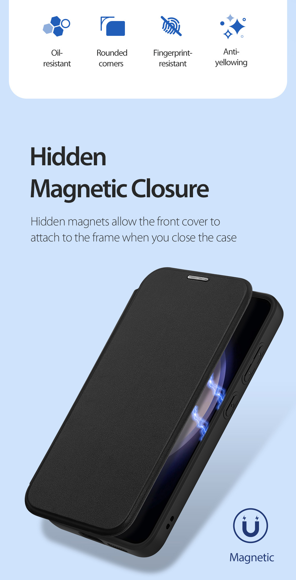 Hidden magnets allow the front cover to attach to the frame when you close the case, strong magnetic closure keeps your phone encased in the case.