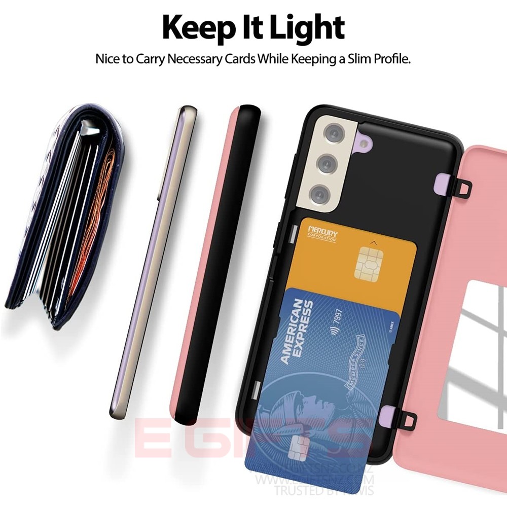 - [Card Holder] Dedicate to all card carrying folk. The card storage part is designed with a curve, so you can store 2 cards from bottom to top more easily. In addition, attachable hidden mirror inside is designed specially for quick etiquette checks. (Please remove the scratch resistant film before use.) Getting ready to go out is easier than ever.
