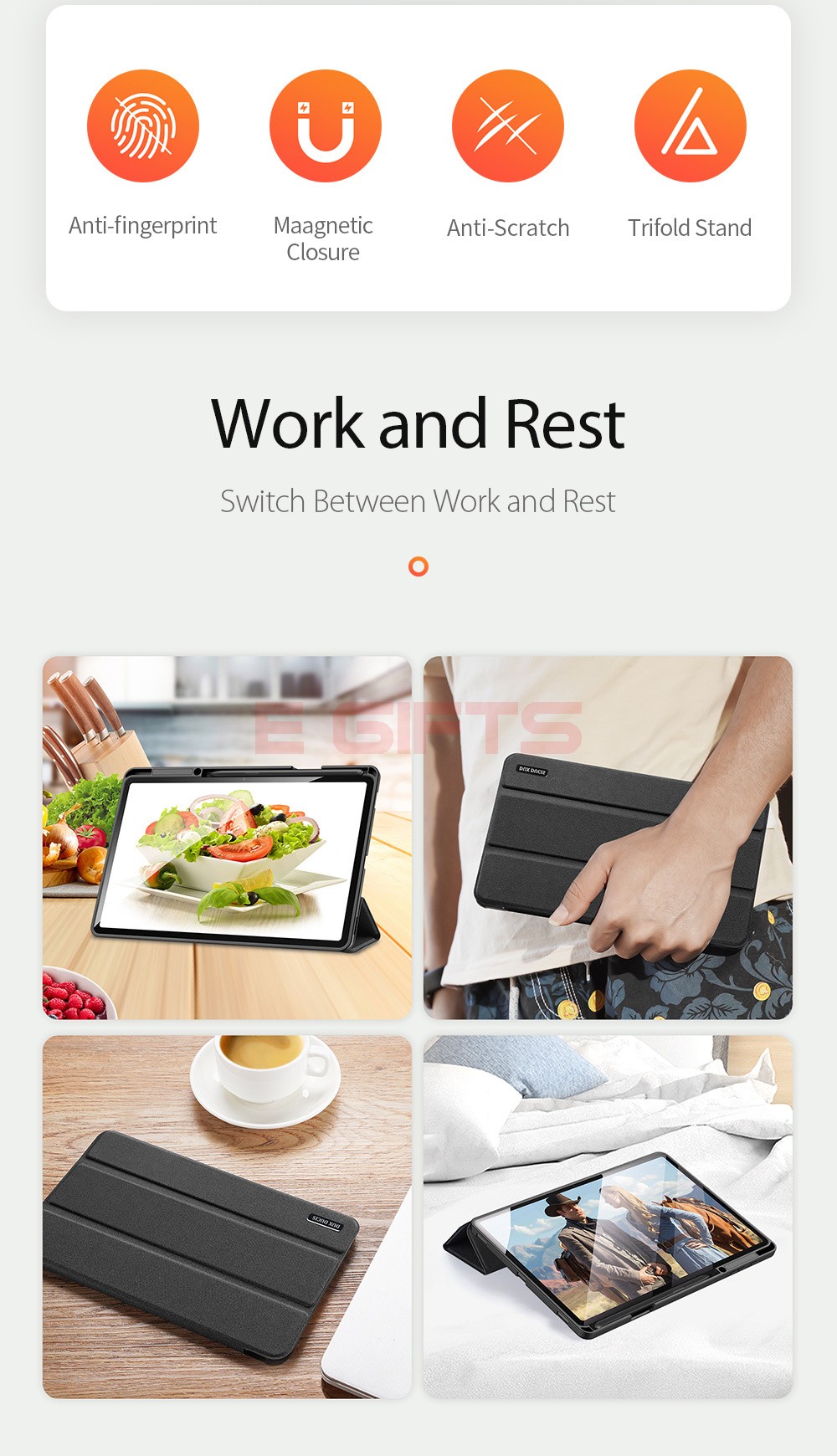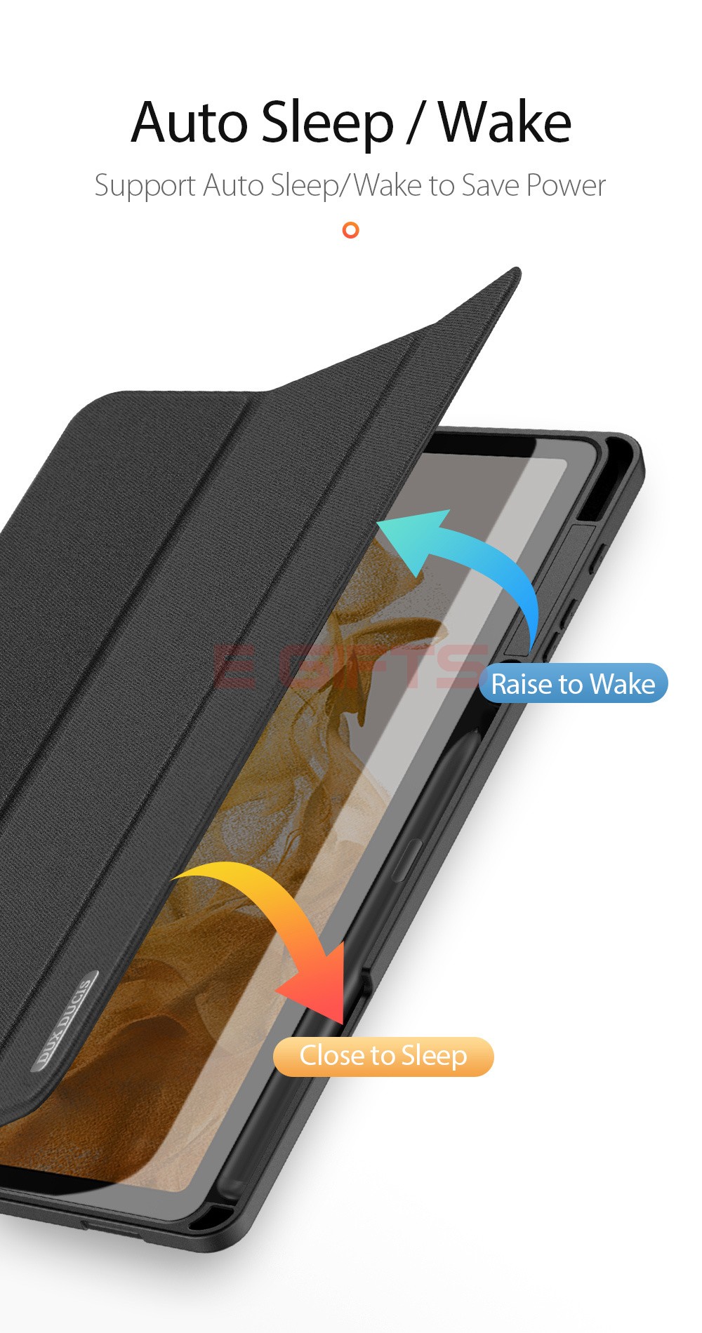 Comes with wake/sleep function, open the case, the tablet wakes up; close the case, it sleeps.