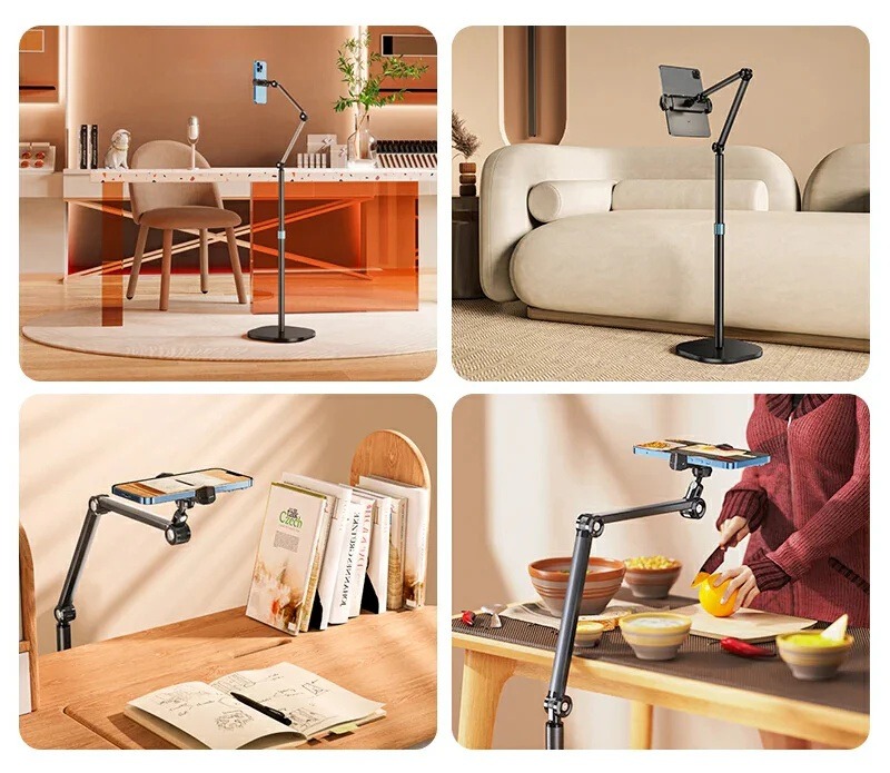 - Multi-Functional Floor Stand: This ipad stand is designed for both desktop and floor use, making it perfect for various scenarios like movie watching, live streaming, overhead shooting, and phone/tablet broadcasting.