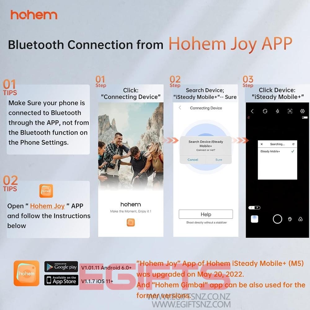 - Bluetooth connection instructions (1) Make sure the Bluetooth is turned on and not connected to other devices (if any, please disconnect from the phone setting first). (2) Open the Hohem gimbal app and click “Connect Device” In the app’s stabilizer model selection interface, manually select the corresponding stabilizer model and click to connect the device. (3) If you have tried Operation 1 & 2 but can’t connect it, turn off Bluetooth, redownload the app, and repeat operation