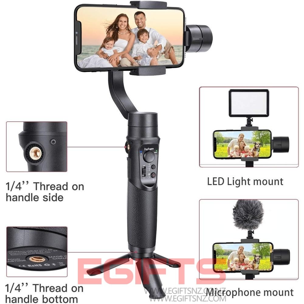 - 【INTUITIVE HOHEM JOY APP SPEED BLUETOOTH CONNECTIVATION】Download the Hohem gimbal app to Android or iOS smartphone for Bluetooth connection. Parameter settings and calibration help you master the gimbal better. Recenter and sport mode on the back for quick transition. Ergonomic handheld With three universal 1/4-20 threads, you can mount more photo accessories, microphones, video lights and tripods