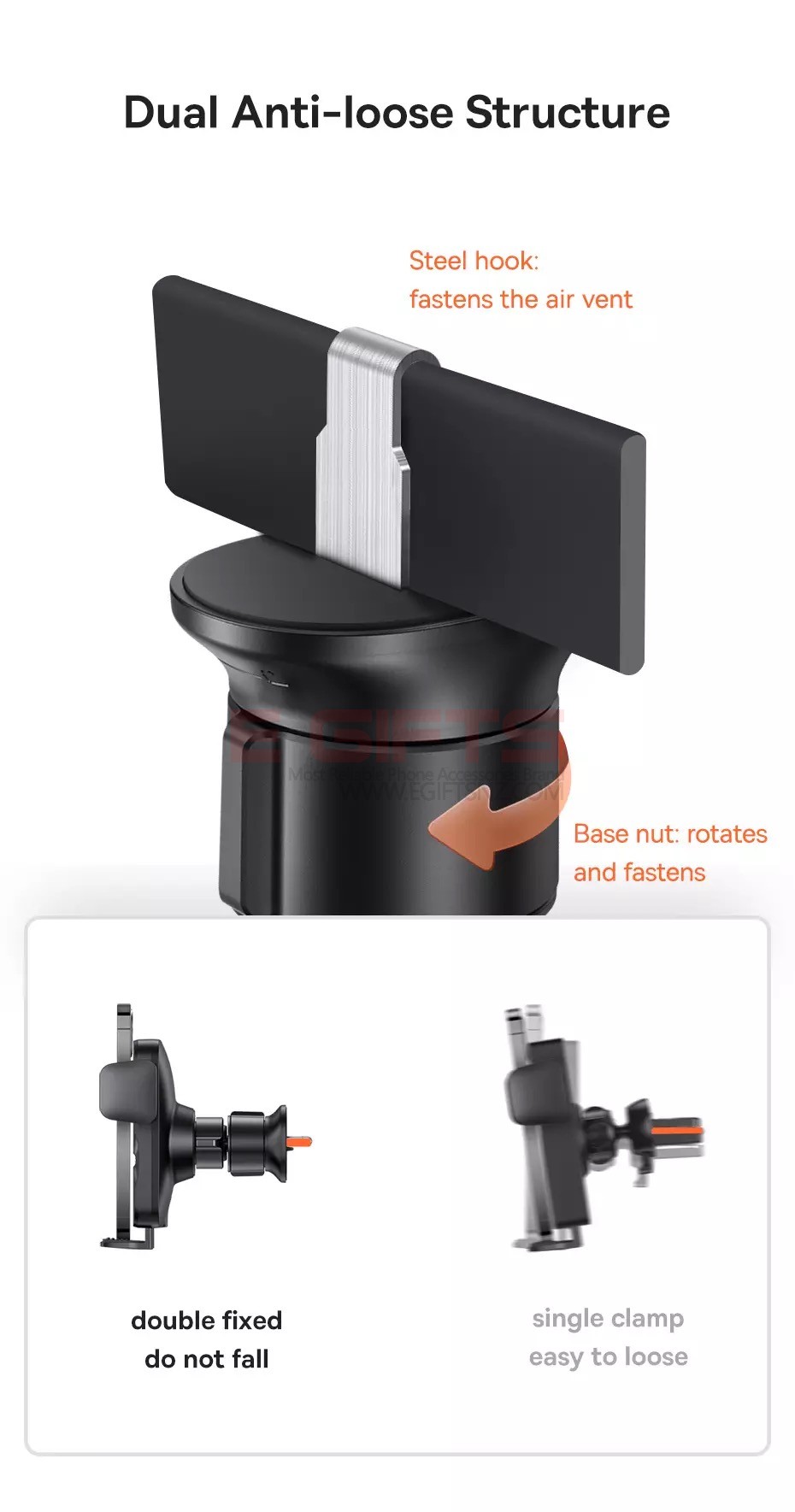 Hollow soft silica gel pads to cushion impact force, and a triangle clamp locks in the phone firmly without noise. - Direction Adjustable and Precise Alignment