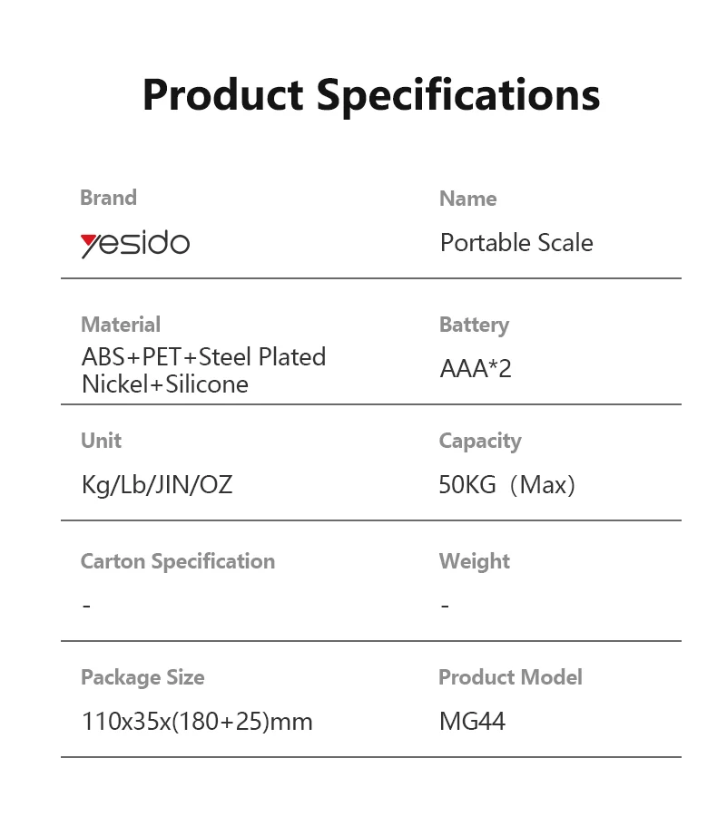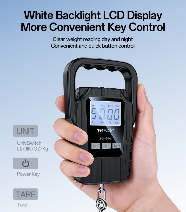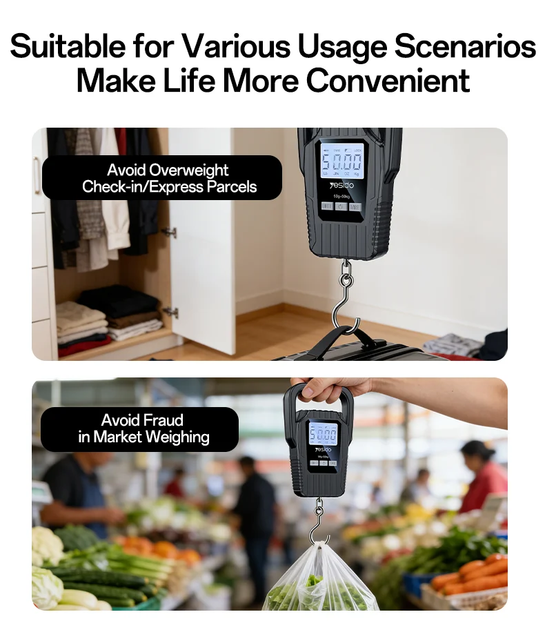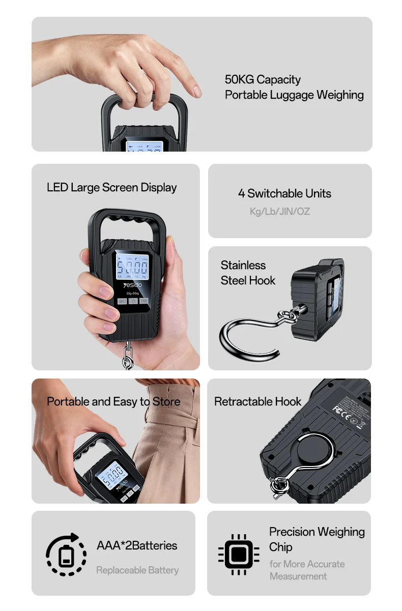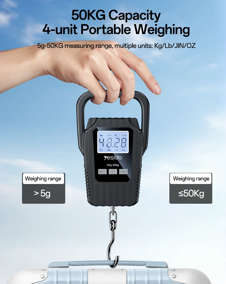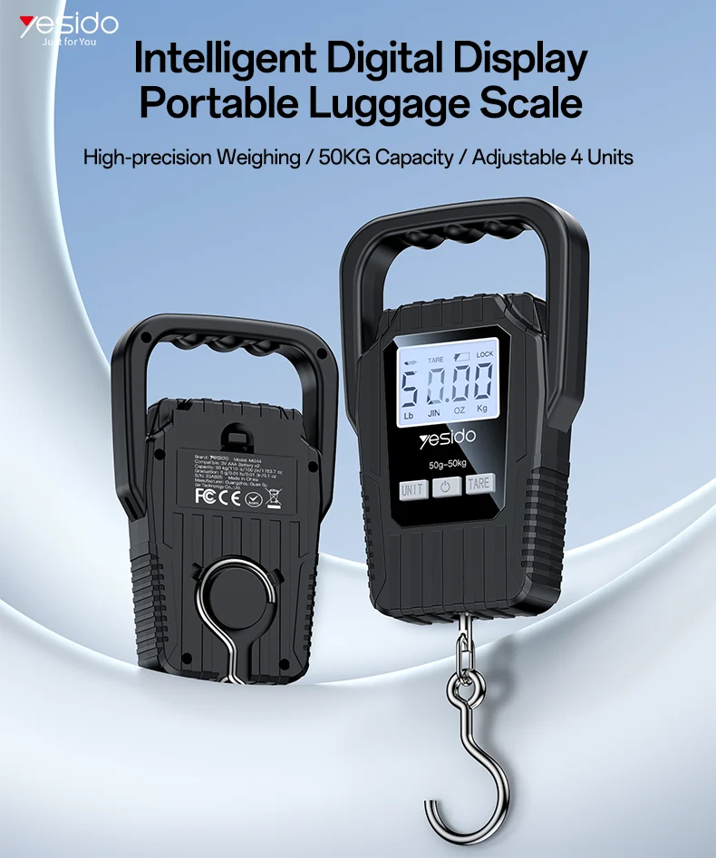 The Yesido MG44 Portable Digital Luggage Scale is a compact and reliable weighing tool designed for travelers and everyday use. With high-precision measurement, a clear LED display, and multiple unit options, it helps you avoid overweight luggage fees and ensures accurate parcel weighing anytime, anywhere.